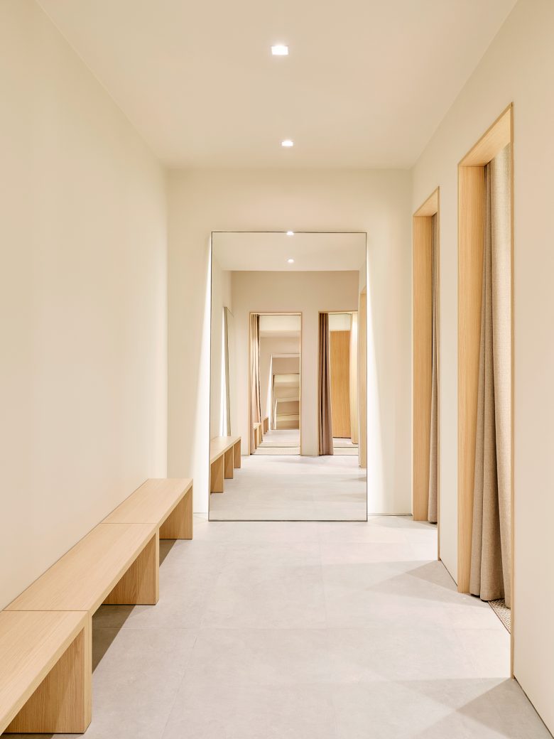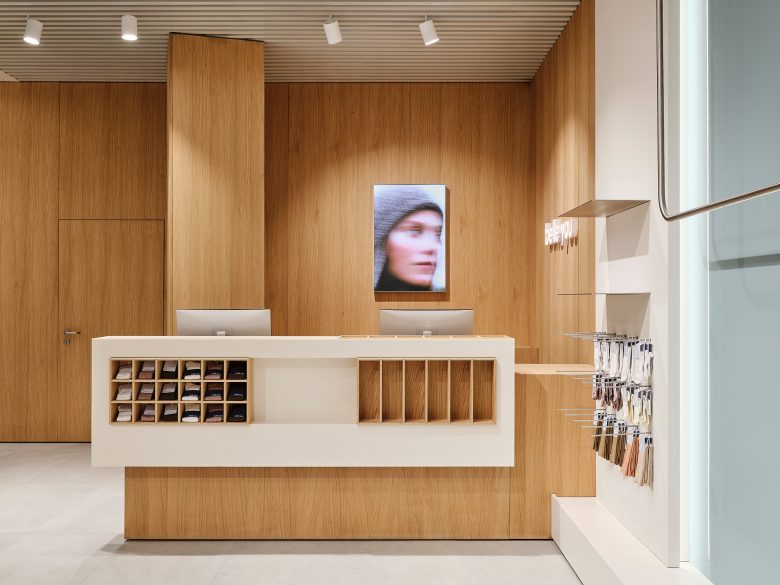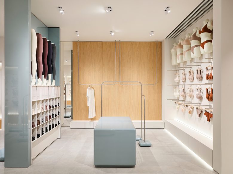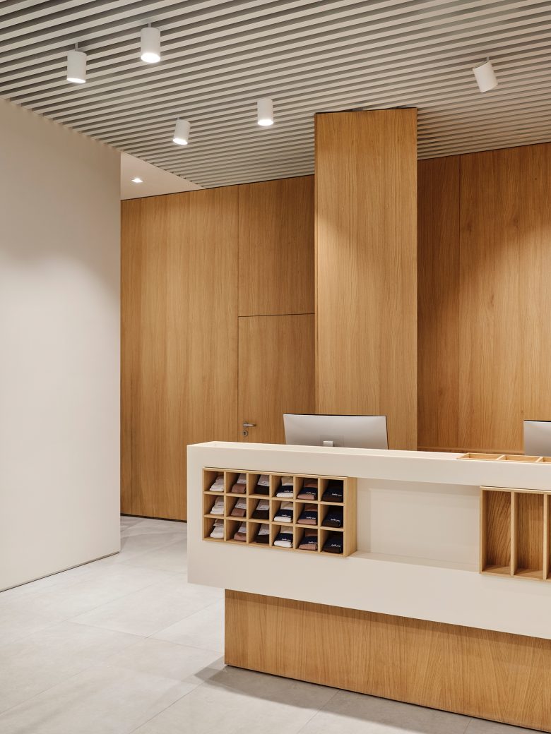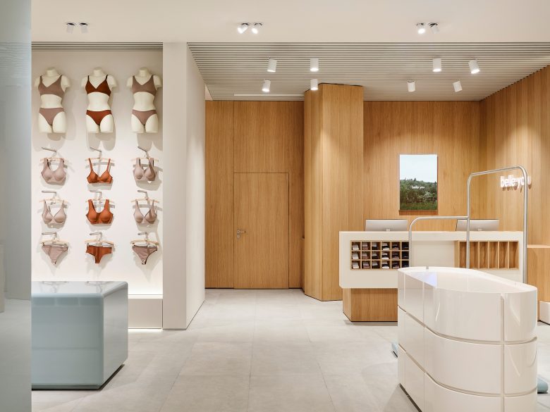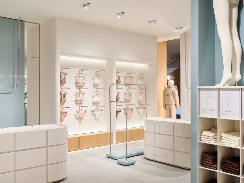 A central column was integrated into a wooden shell and linked to the checkout, becoming part of a cohesive composition. Wood, a delicate milky tone, and soft geometry form a frame for a green-blue accent and expressive furniture. Rounded rails, glossy “white chocolate” cabinetry, soft cushions at the base of the rails, and backlit niches echoing body lines create a calm, intimate atmosphere. The checkout reads as a small “room” clad in veneer panels, adding focus. Enlarged fitting rooms and a carefully tuned rhythm of light and zoning let customers pause, relax, and choose what truly suits them.
