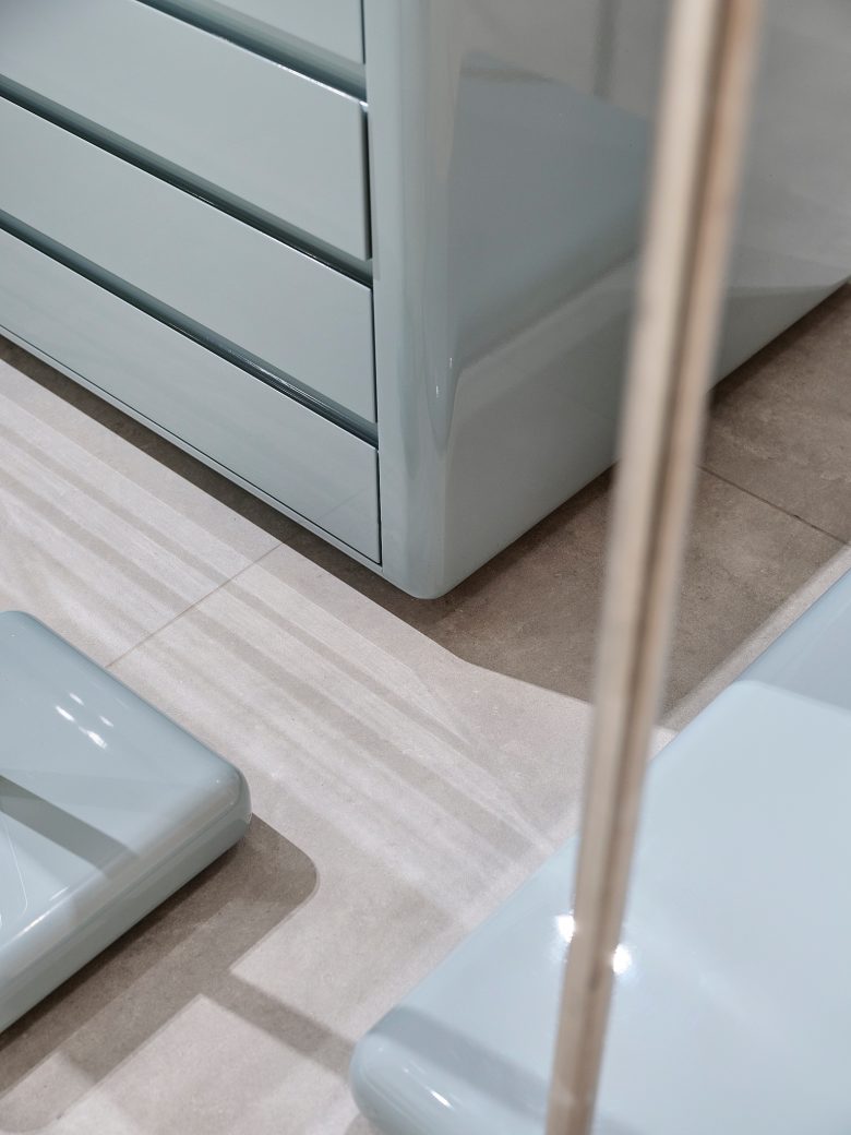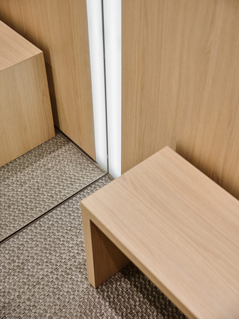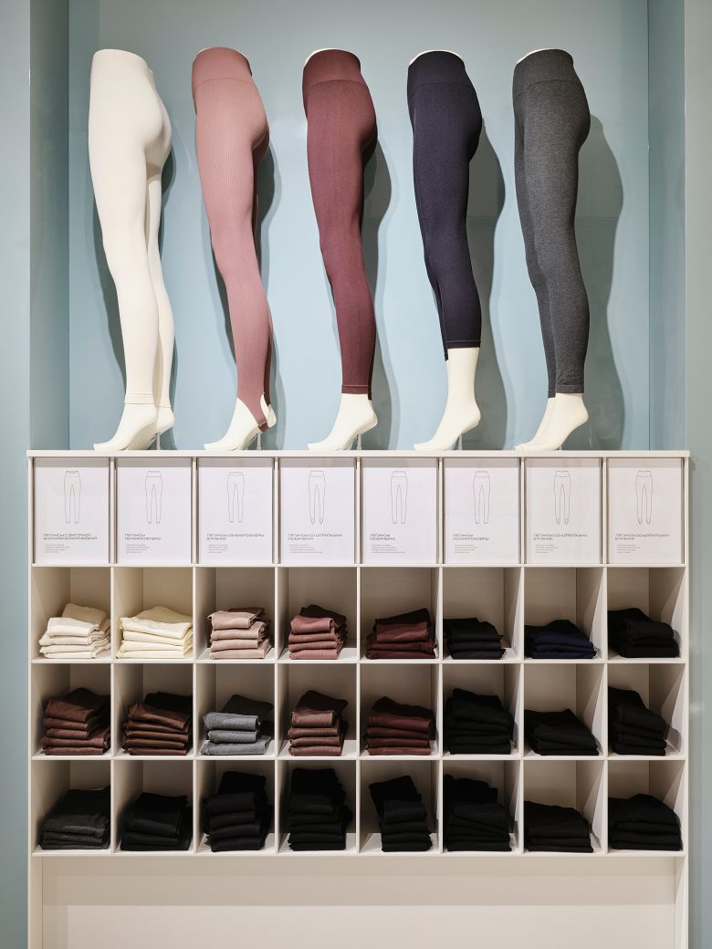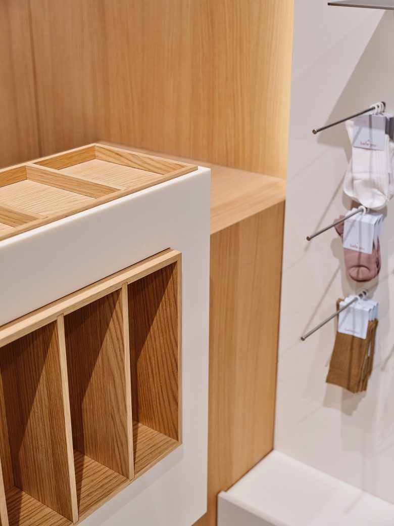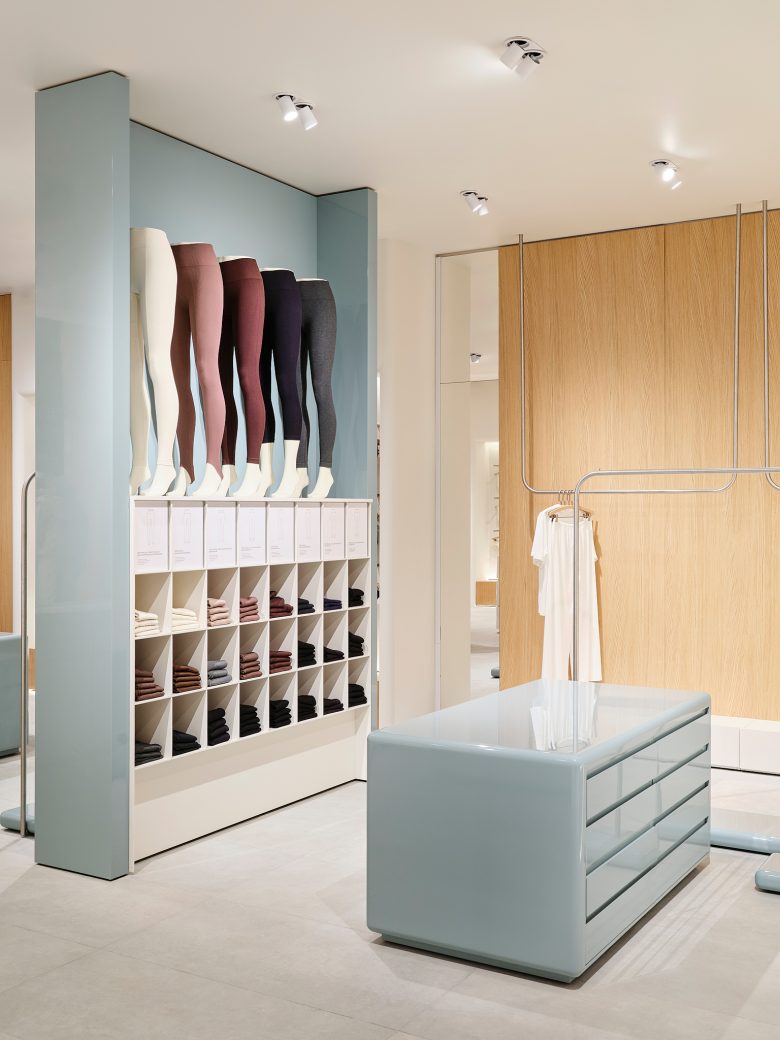A central column was integrated into a wooden shell and linked to the checkout, becoming part of a cohesive composition. Wood, a delicate milky tone, and soft geometry form a frame for a green-blue accent and expressive furniture. Rounded rails, glossy “white chocolate” cabinetry, soft cushions at the base of the rails, and backlit niches echoing body lines create a calm, intimate atmosphere. The checkout reads as a small “room” clad in veneer panels, adding focus. Enlarged fitting rooms and a carefully tuned rhythm of light and zoning let customers pause, relax, and choose what truly suits them.
