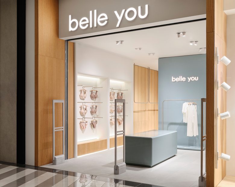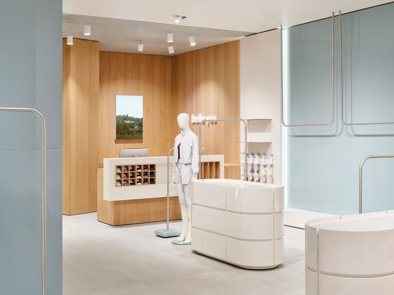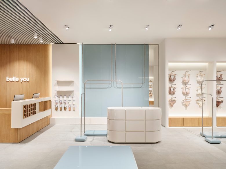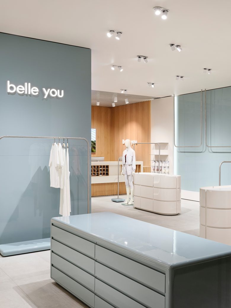 belle you Store at Paveletskaya Plaza — renovated flagship (opened Oct 27, 2025; expanded from 67 to 155.7 m²). Sinitsa Buro rethought the space from a scalable, rational, vandal-resistant mass-market concept into an interior with the brand’s softness and “living breath”. Cold minimalism was replaced by rounded forms, warm wood, and a milky palette, assembled from simple materials yet kept light and feminine.