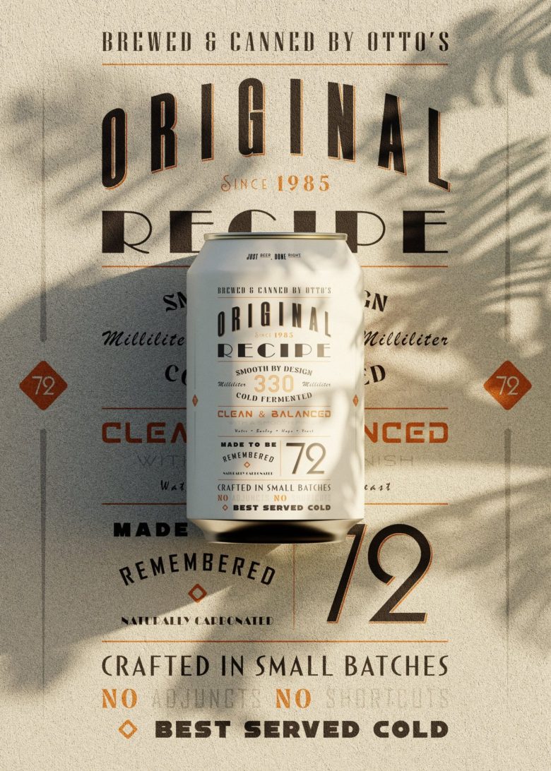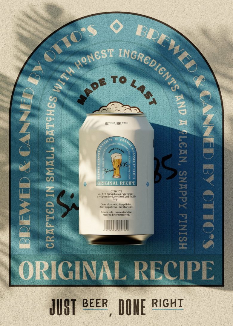 Otto’s 72 is a beer brand rooted in classic brewing and honest design. Inspired by retro labels, the identity uses strong typography, a disciplined grid, and a restrained color system to create a timeless, cohesive range.