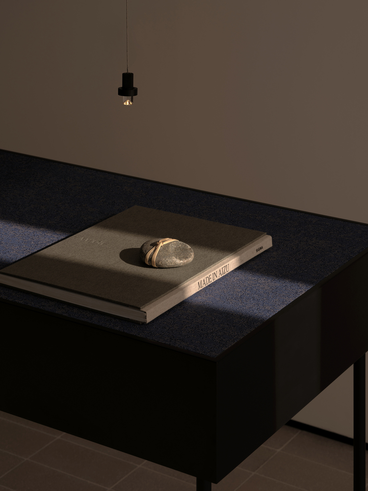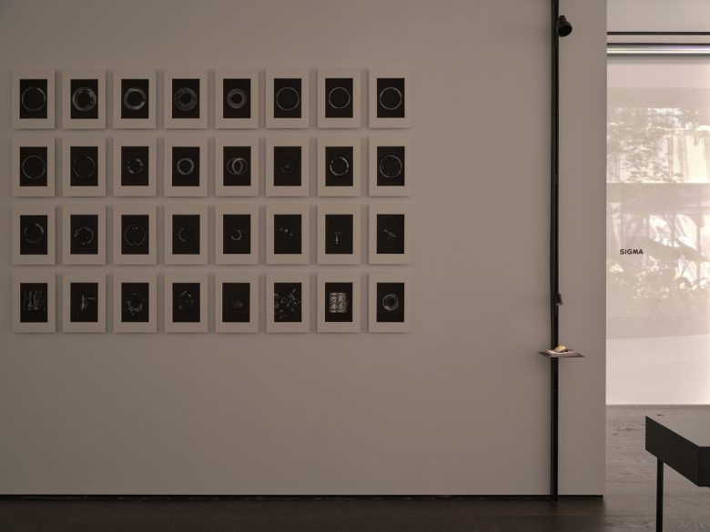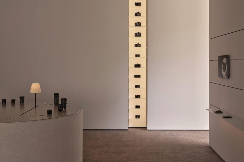 Stepping into the product experience zone, a monumental lens wall rises from floor to ceiling, presenting generations of SIGMA lenses in disciplined order. ONOAA STUDIO developed a triangular column system, studying the mounting mechanisms and specifications across product lines, and custom-molded select fixtures to achieve the wall’s precise display. Beneath it stands a circular island table. Its base is a single block of limestone marked by fossils and weathered traces—compressed and eroded over time—capturing a moment that visitors instinctively record with their eyes.
