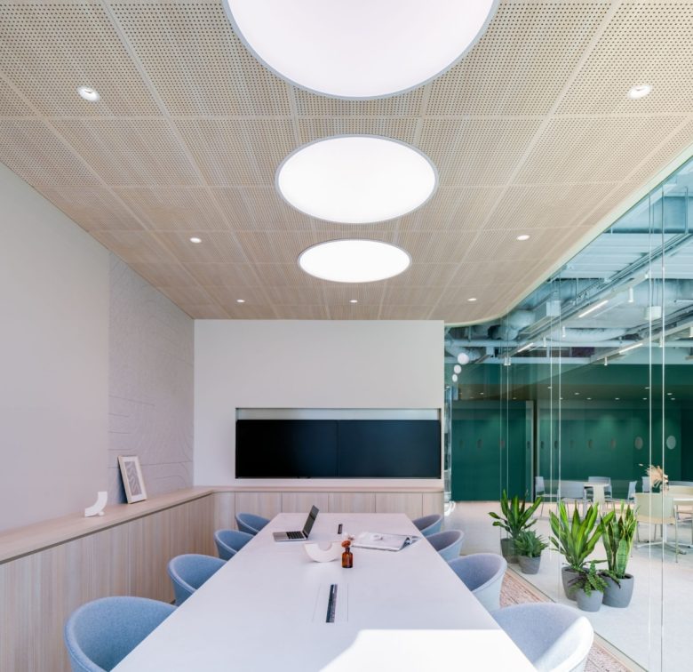 In the broader office areas, an immersive design strategy was employed, highlighted by a bespoke lighting set against a timber-clad ceiling which guides the flow of movement. The workspace is complemented by a variety of thoughtfully positioned amenities, all set against an aesthetic backdrop that unites teams while providing a constant visual and functional flow.