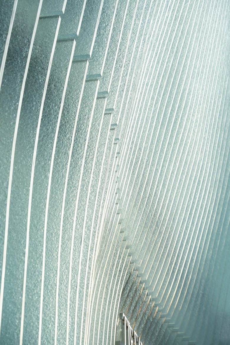 At night, the glass – already carefully selected for its natural blue tone – is illuminated in Tiffany & Co.’s iconic Tiffany Blue®, giving the store a diffuse glow. To ensure an elegant appearance, lighting modules are built directly into the specially designed brackets that hold the glass fins, minimising the presence of hardware that might distract from the subtle light effects created by the glass.