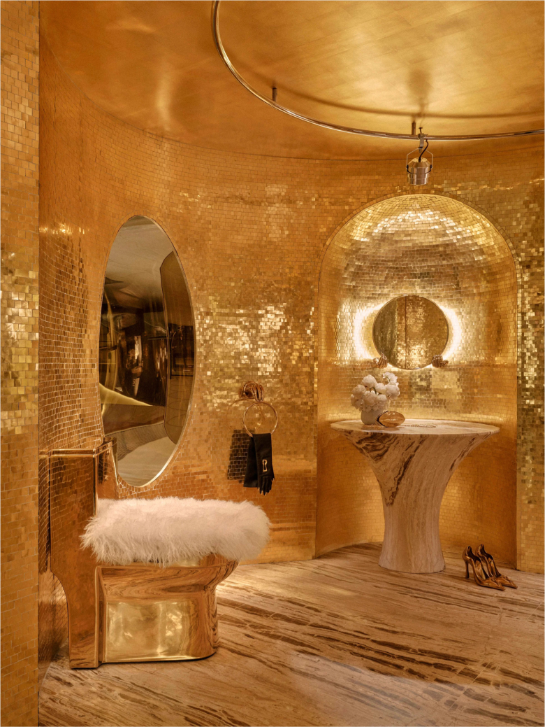 The boutique façade is unapologetically dipped in gold, as if signalling its reputation for highly exclusive womenswear and jewellery pieces. Taking ample cues from Hôtel de Fontpertuis, an ornate 18th-century townhouse on place Vendôme in the French capital which now serves as the Schiaparelli headquarters, it’s more a salon than a retail space – mind you, access is by appointment only – and consists of a sequence of interconnected rooms. The settings are dazzling, featuring a palette of lacquered wood, brushed metal, mirrored surfaces, and marble motifs. The main room, which features a slightly vaulted ceiling adorned with many of the house’s signature Surrealist symbols and motifs, connects a gold-infused boudoir on one side and a homey private nook directly opposite. The new Schiaparelli boutique stocks a selection of apparel, including denim pieces, bags and jewellery pieces. © superfuture