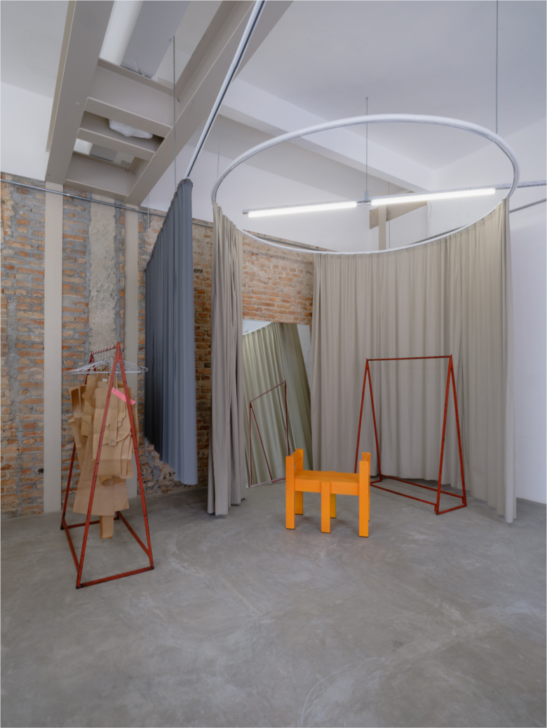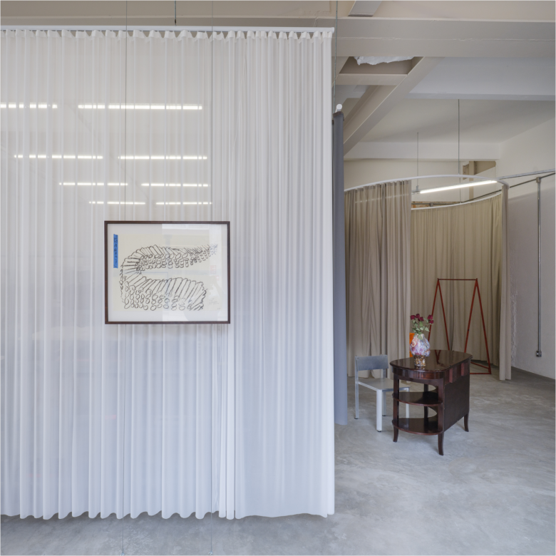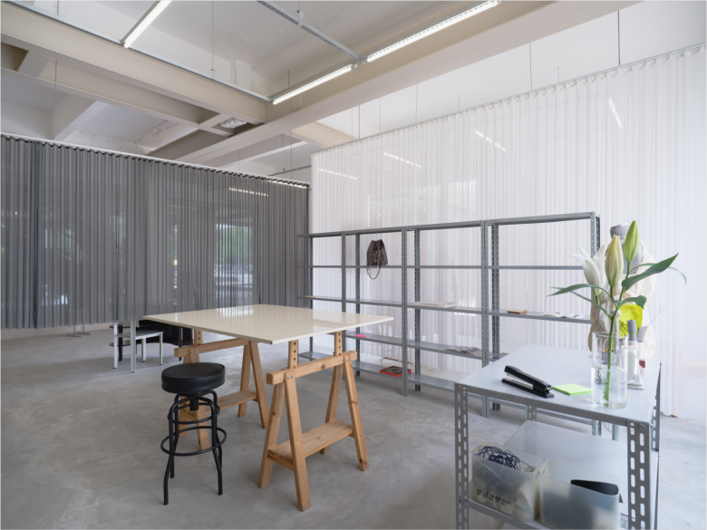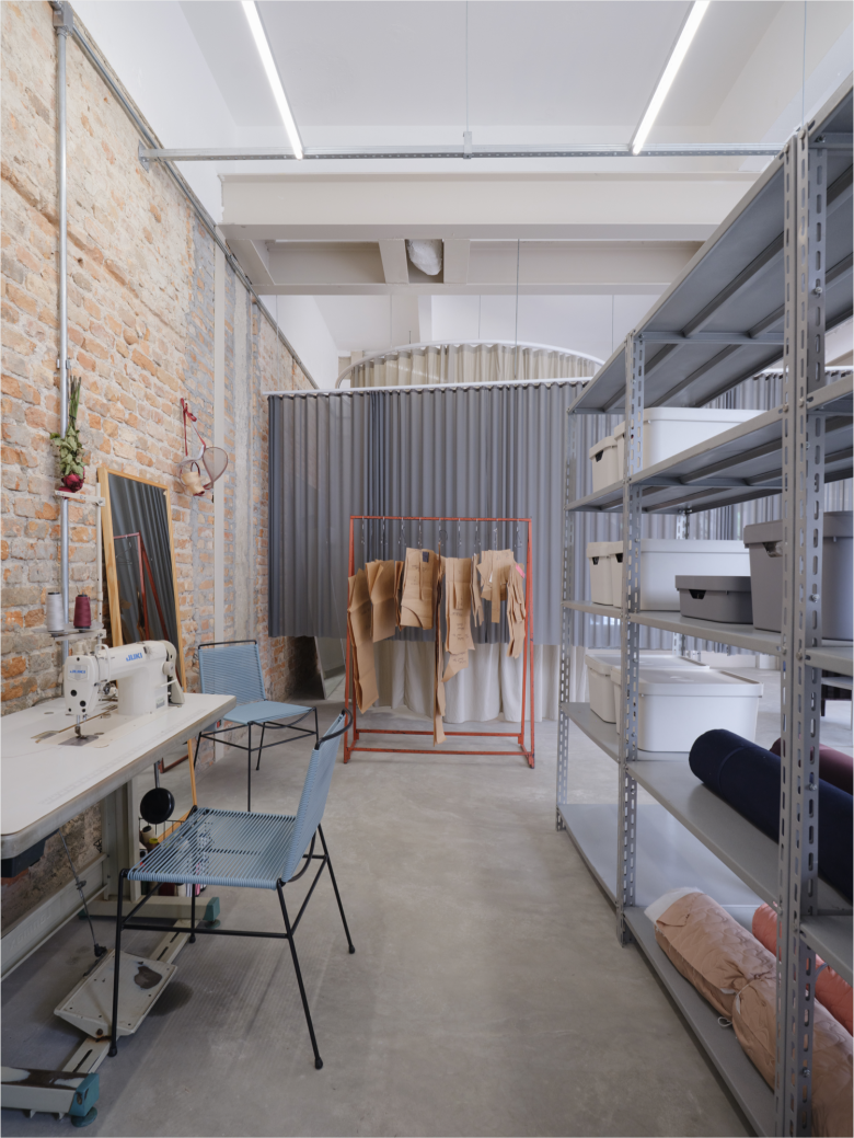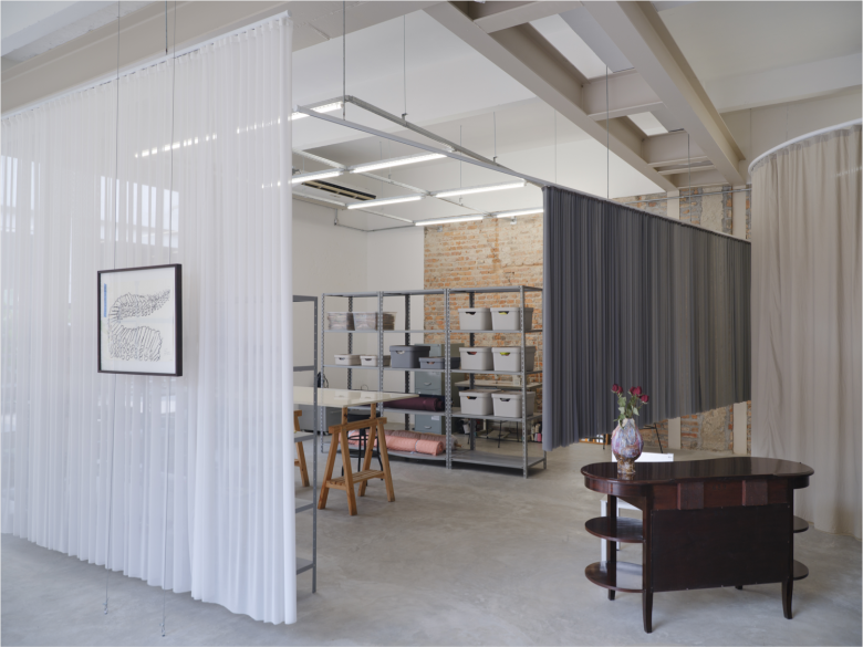 The interior design of the repurposed building, created by local creative collective CLUBE, uses the building’s original shell, either sections of bare bricks, freshly painted walls and ceilings, and concrete beams, as an intentionally eclectic backdrop. A variety of fabrics, both translucent and opaque, and suspended by rails, add an unexpected layering, serving as dividers that separate ÃO‘s showroom from its workspaces, while also defining a circular fitting room. Interestingly, the fabrics intentionally come in the hues white, grey and beige, adding depth to the various settings. Lighting is simple and functional, comprising of a suspended metal frame with tubular lights attached, and a separate one for the fitting room. The new ÃO store carries the brand’s full collection of dresses, skirts and tops. © superfuture