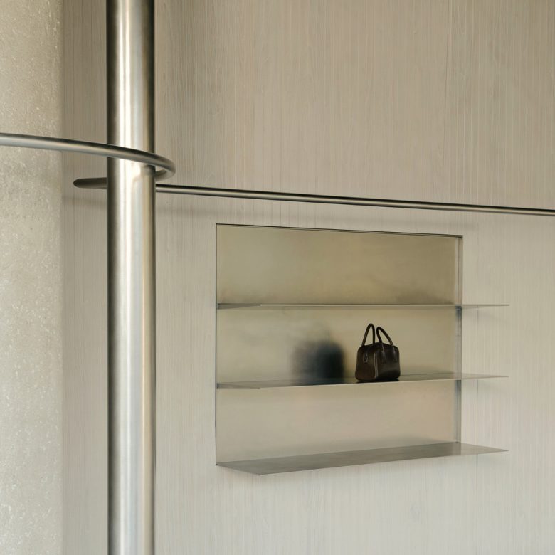 Hand-dyed timber slats recede into the background, imbuing the showroom with a gallery-like simplicity and emotional warmth, providing the ideal backdrop for the garments. When delicate fabrics are introduced, a silent dialogue emerges between hardness and softness, weight and lightness, the rock-like stands and the flowing textiles.