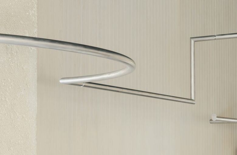 Confronted with an irregular original site, SHISUO returned to the fundamental element of fashion display: the hanging rail. A “single continuous rail” is allowed to morph in response to the existing walls, columns, and rainwater pipes. It traces the walls, bends to evade columns, and rises to allow passage, absorbing the chaotic nature of the environment and transforming it into a dynamic vitality.