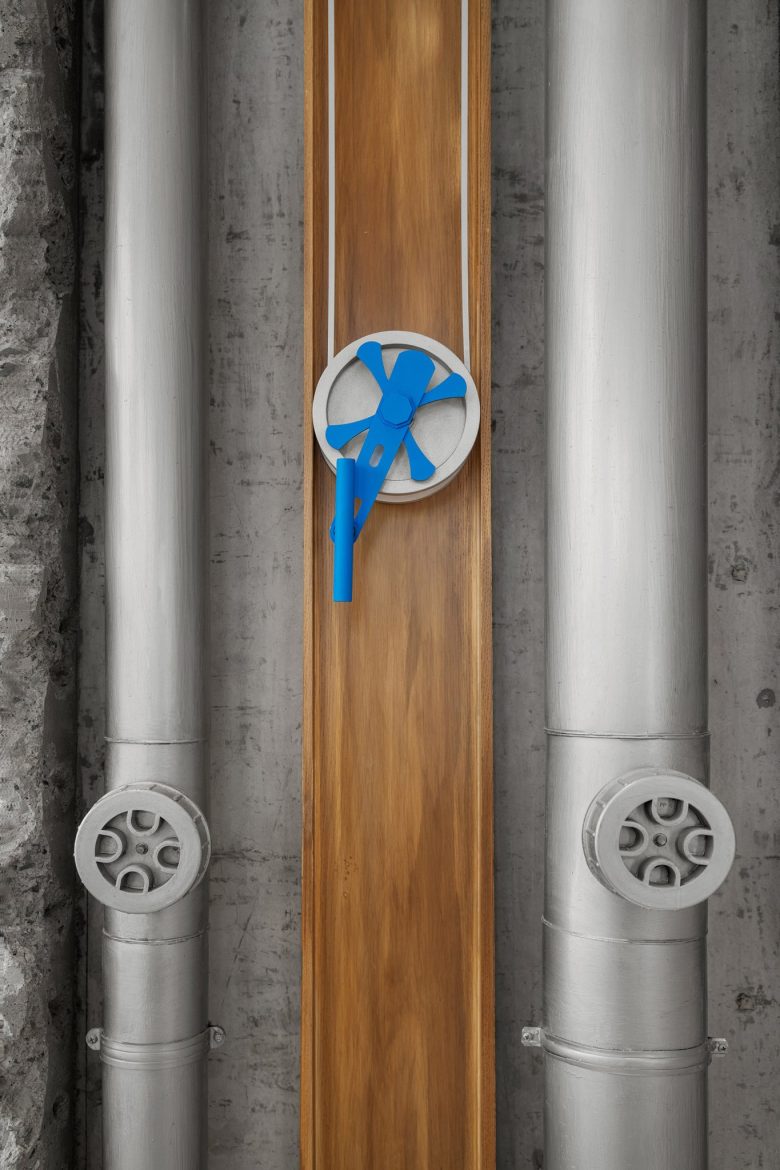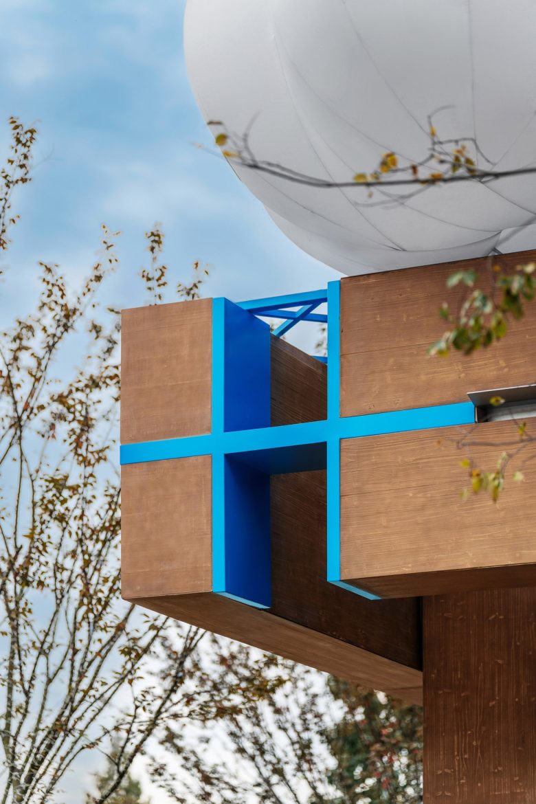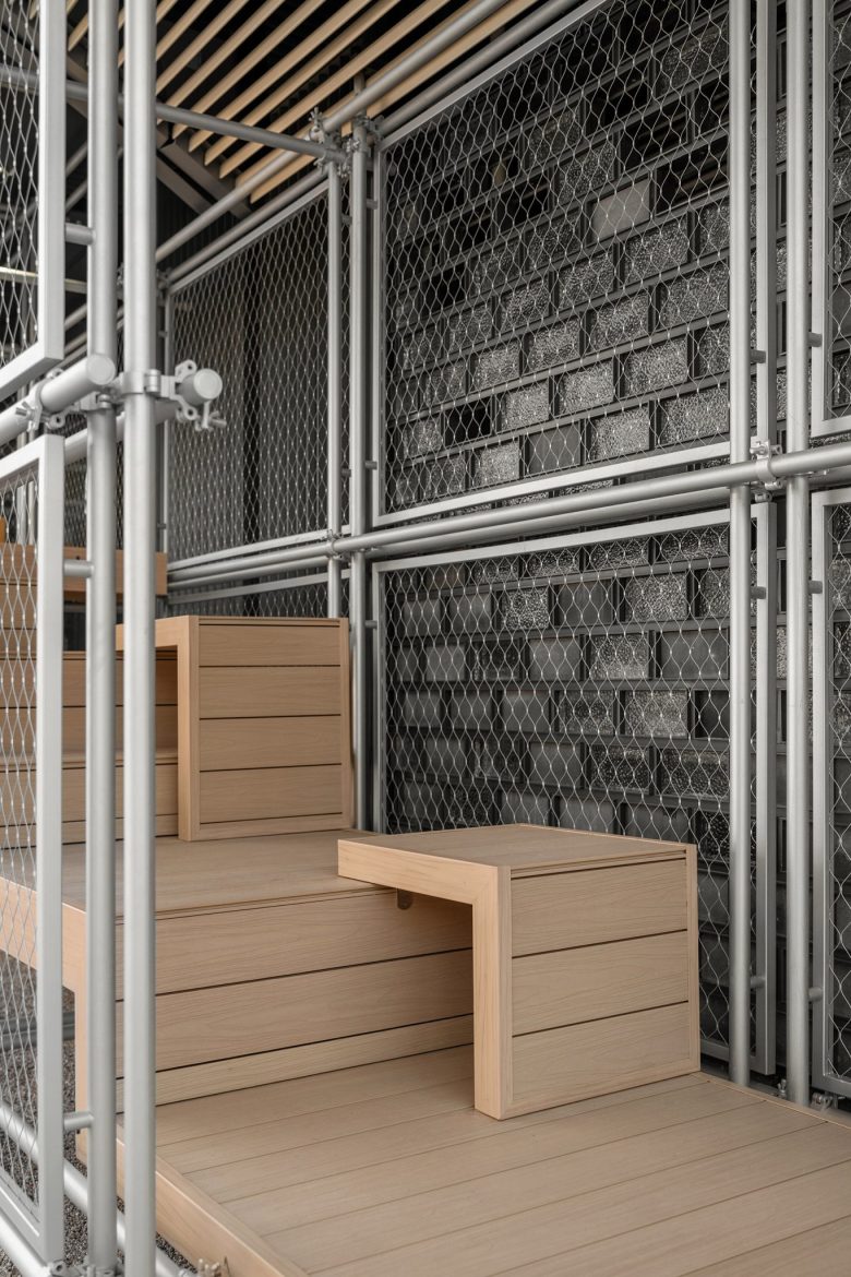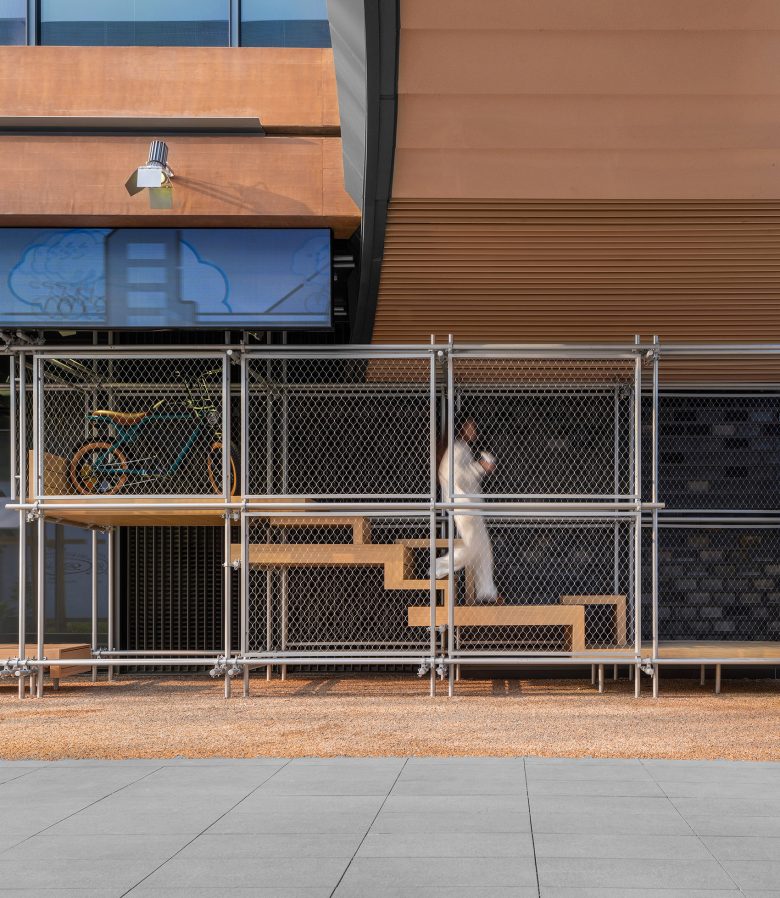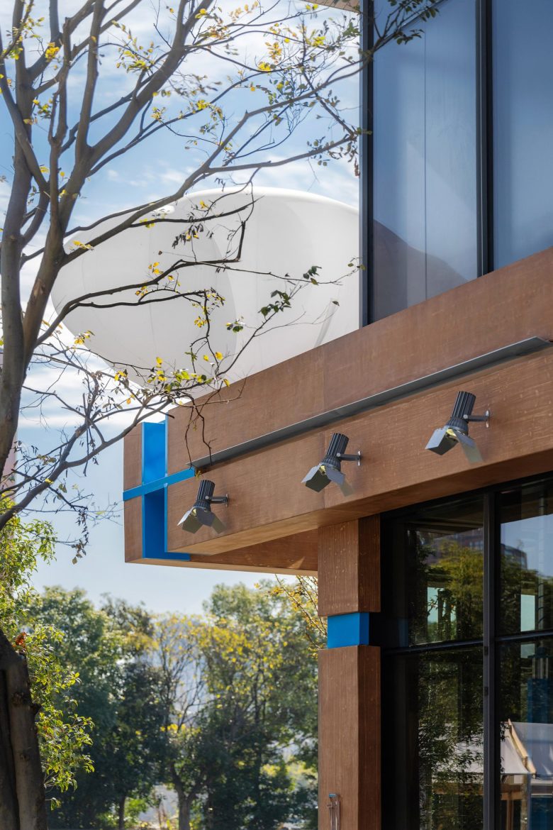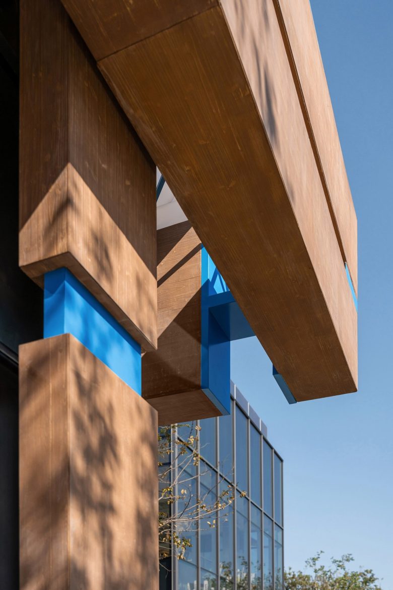 Facade uses mortise and tenon, metal-wood weaving, blue joints matching brand color. Cement wood panels are outdoor-durable, echoing the brand’s “connection” core.