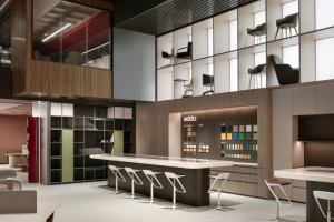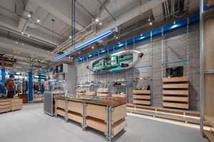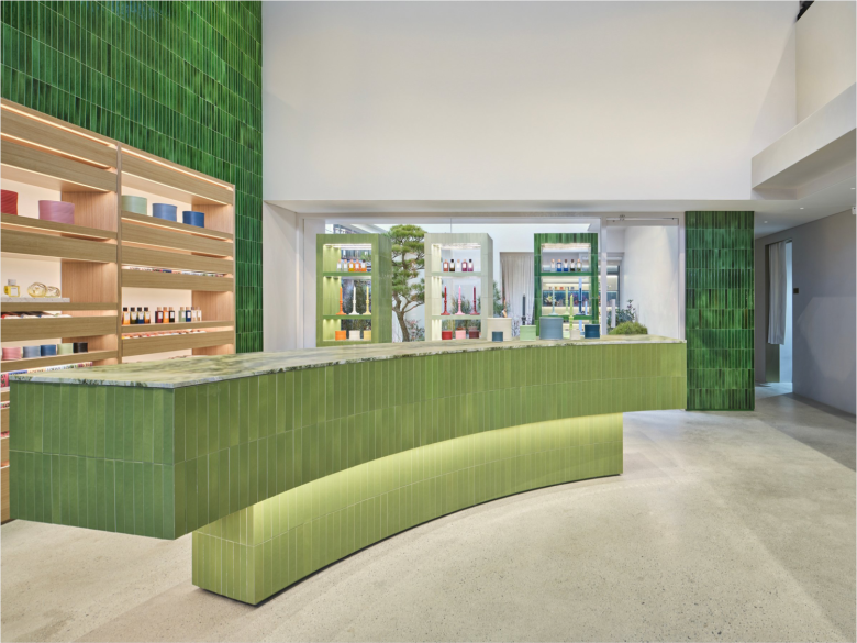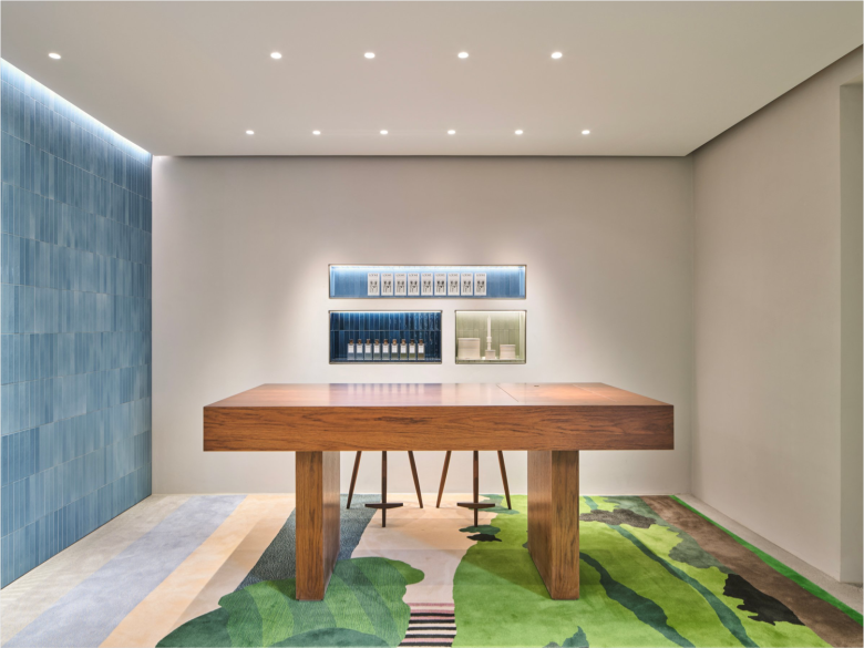 Floods of daylight permeates the ground floor thanks to floor-to-ceiling glass at the front, and the windows facing the patio garden. Upon entering, shoppers encounter a low curved display in the window, laden with coveted merchandise, and situated right behind, a large curved counter with a marble top, both clad in soft green glazed tiles. The side walls are also covered in tiles, but in a deeper shade of green. One side sees a large recessed shelving unit in light timber, flanked by three standalone cabinets, while opposite, beside the staircase, more recessed nooks filled with a variety of products and a small counter with sink can be found. At the back, beside the patio, shoppers can retreat to a cozy seating area and a special nook filled with Crafted Collection products. Here, the backdrop comprises glazed tiles in a soft blue, and a custom-made rug inspired by British textile designer John Allen‘s colourful tapestry Rosley Clump.