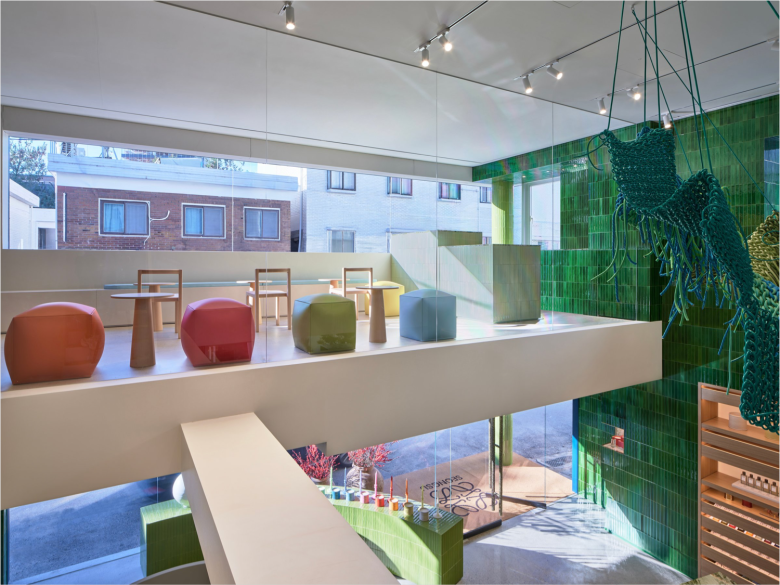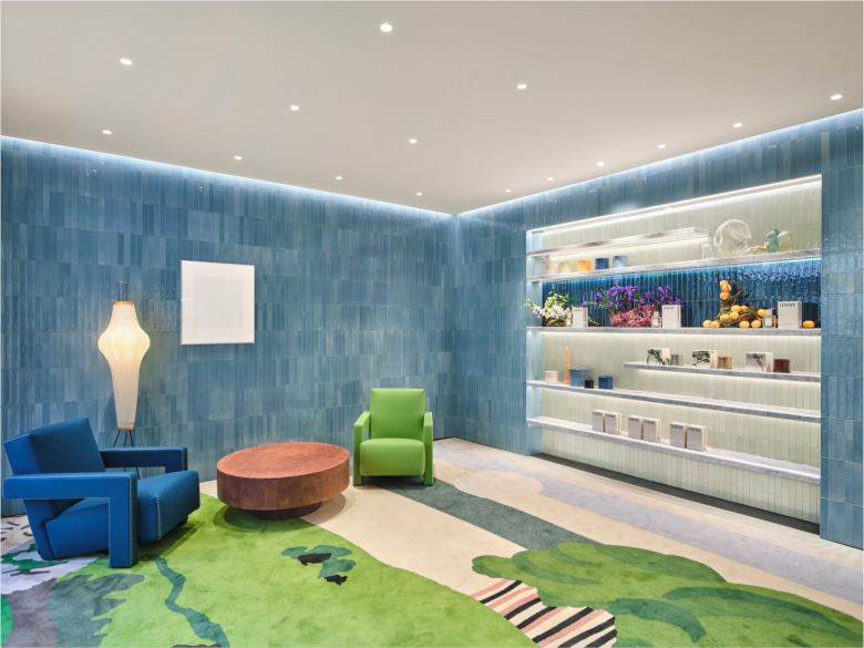 There’s no denying—Seoul is one of the planet’s most innovative and dynamic retail arenas, and the recent inauguration of standalone LOEWE store, albeit a special one, bears witness to this enviable stature. Nestled in Seongsu, the South Korean capital’s most happening shopping area du jour, the newest LOEWE boutique is dedicated exclusively to its fragrance collections. And mind you, its the first LOEWE Perfumes store of its kind anywhere! Occupying 344 sqm. (3,703 sq.ft.) across two floors of a modern structure, the retail space features the brand’s signature aesthetic created by its in-house design team at home base Madrid. Standing out from its surroundings, the low-rise building is entirely clad in hand-made, blue ceramic tiles from Spain, and the material also extends abundantly inside where it appears other hues, such as emerald, lime green, and turquoise.
