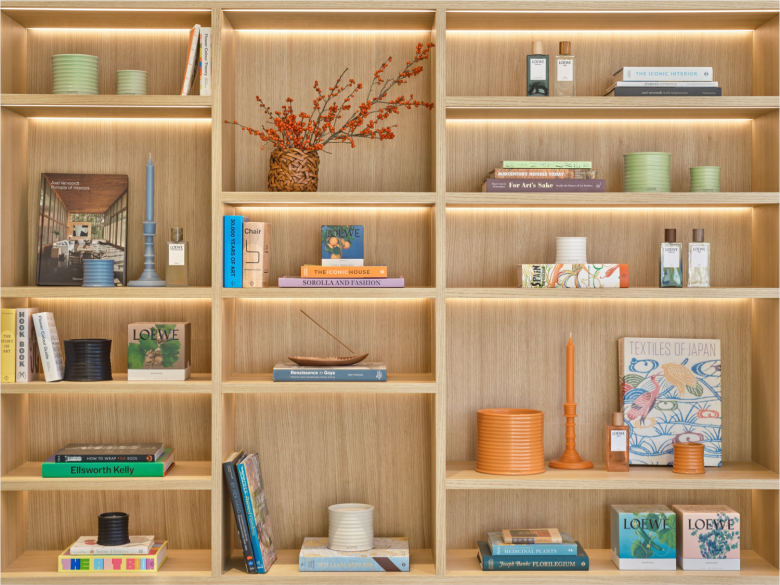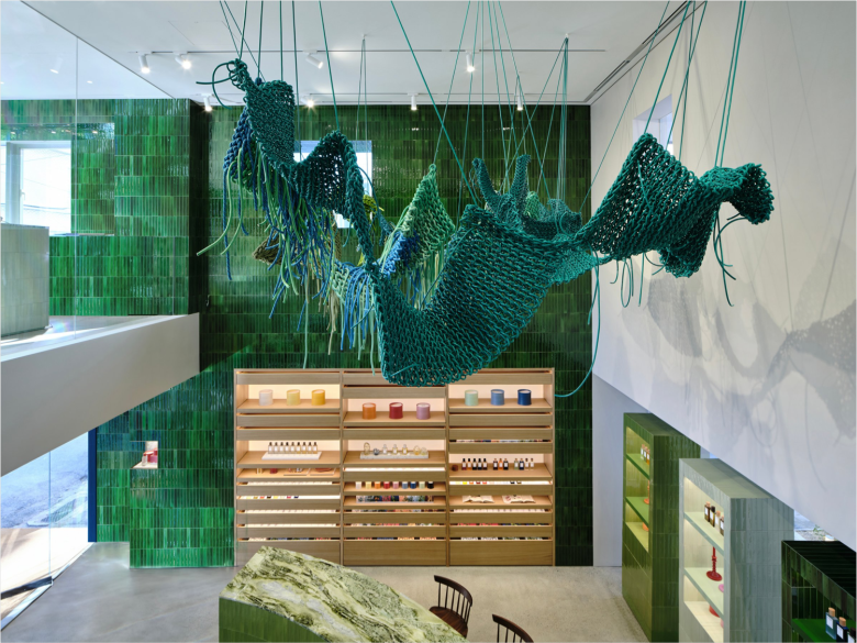 Adding to the lifestyle concept of this LOEWE store is a café on the upper floor offering a special menu of drinks and desserts inspired by the collection of the brand’s perfume products. The luxury brand that’s not only known for its artisanal excellence, but also its strong affiliation with leading artists and designers. The front section of the ground floor setting sits below a light-filled atrium which is adorned by a large suspended knitted artwork by South Korean artist Kwang-ho Lee. Across the premises a number of striking statement pieces can be found, including Gerrit Rietveld‘s chunky Utrecht chairs, the Akari E floor lamp by Isamu Noguchi, and two Mira chairs by George Nakashima. The new LOEWE store stocks the full range of fragrances, home fragrances, scented candles and bath products. © superfuture