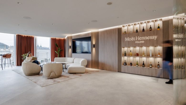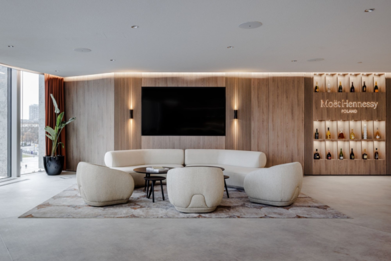Moët Hennessy Poland was in need of a headquarters that would reflect the brand’s heritage and prestige while ensuring a functional and sustainable workspace. The brief emphasised the need for a representative space that strengthens brand identity and provides a high-quality experience for both employees and business guests.