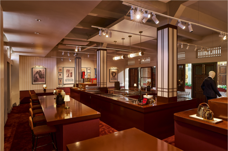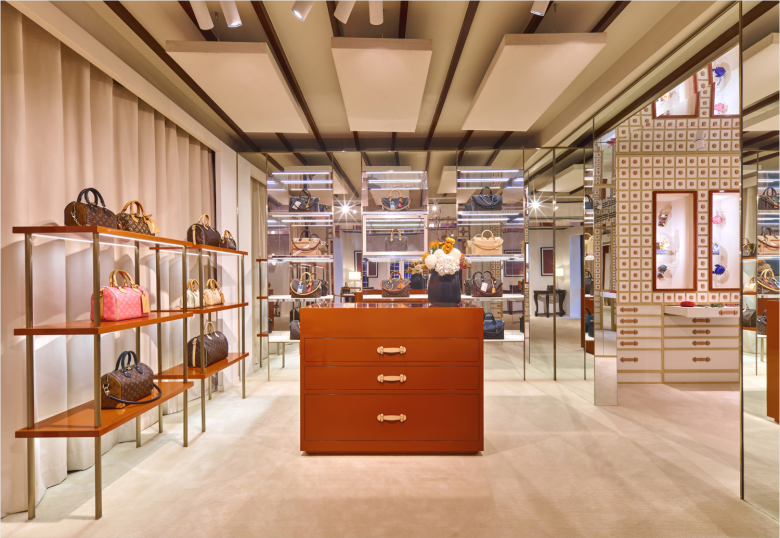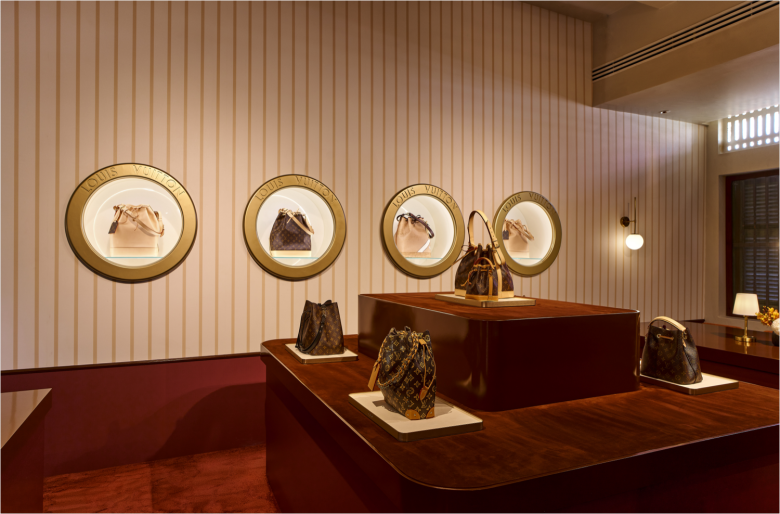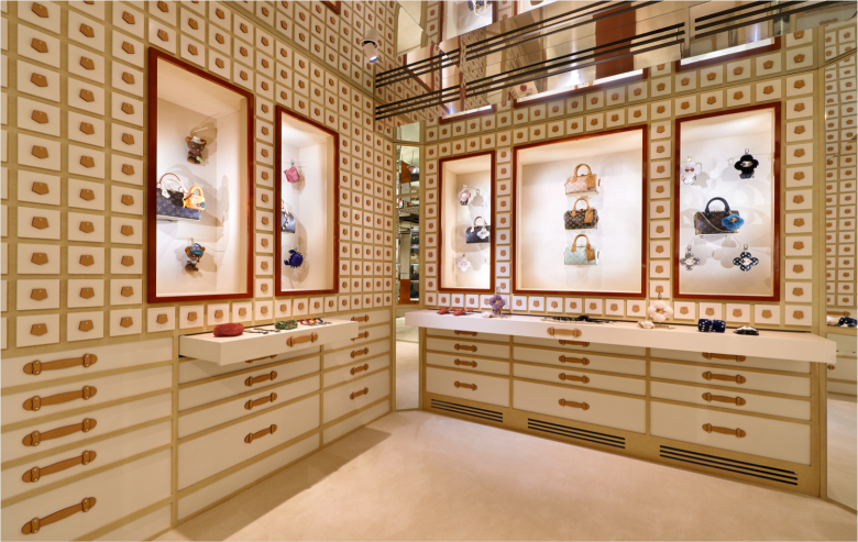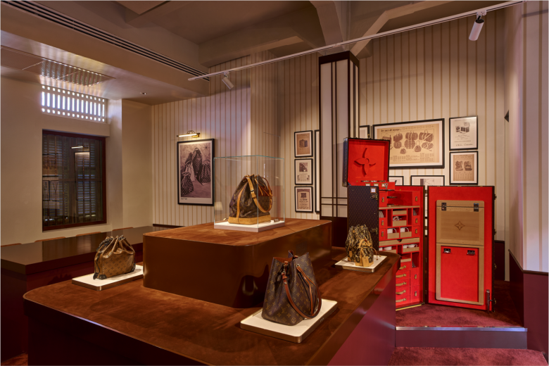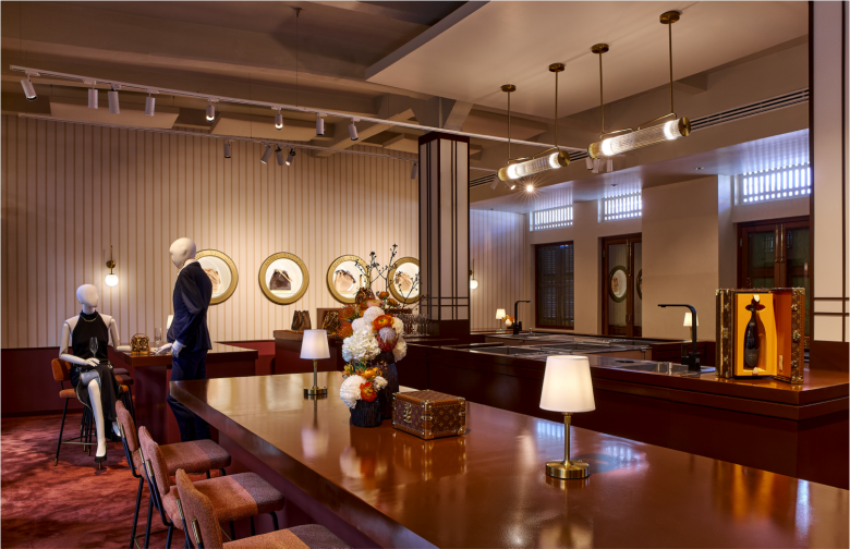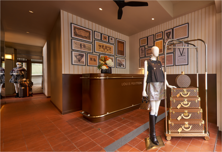 And when stepping inside, shoppers come across a reception desk with travel-inspired props. One floor up, the hotel lobby presents a tribute to the Keepall, the iconic travel bag which was first introduced in 1930. Its ingenious foldable construction and resilient Monogram canvas marked a new chapter, fusing practicality with elegance. Adjacent to the lobby, the Speedy P9 Safe Room reveals the eponymous bag, a contemporary reinterpretation of the classic Speedy by Louis Vuitton‘s men’s creative director Pharrell Williams. Mind you, a conciergerie can also be found here, allowing visitors to enjoy hot-stamping services and a range of venue-specific customisation options conceived.