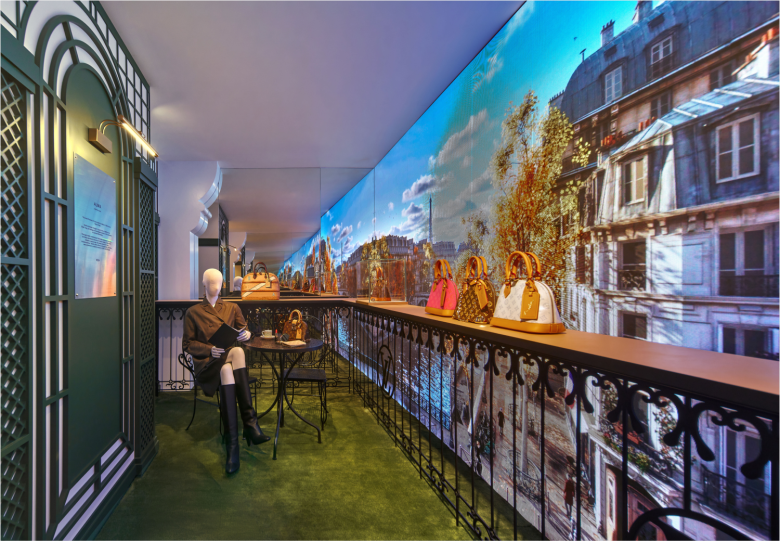 Designed in the early 1930s alongside the Keepall, the Speedy ushered in a new era defined by speed, movement, and modern travel. The room features a vintage telephone installation through which guests can hear the Speedy’s heritage narrative, while a dressing-room-inspired area places the bag at the centre, accompanied by a curated selection of charms and styling suggestions that showcase Louis Vuitton’s tradition of personalisation and contemporary flair. Concluding the journey, the Alma Terrace celebrates the Alma bag. Introduced in 1992 and named after place de l’Alma in Paris, it’s defined by architectural lines and a structured silhouette inspired by the Art Deco movement. The space comes alive with a large-format screen projecting alluring city vistas (open through Mar 15). © superfuture