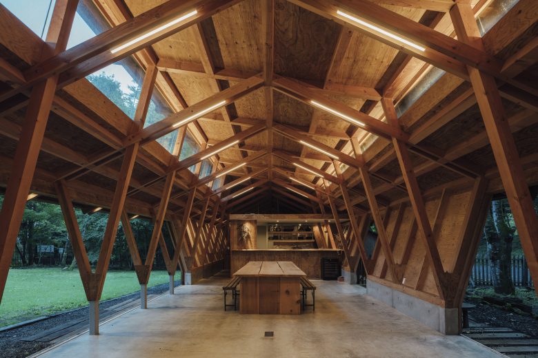 This building represents the final phase of that long-term process. It functions as a lounge where visitors gather, while also serving as a dog training space during rainy weather. When the doors on both sides are fully opened, views extend through the building toward the surrounding forest. Soft daylight filters in from high clerestory windows set between the three overlapping roof planes. The space maintains an intimate relationship with the forest while embodying a sense of transparency rooted in Japanese architectural sensibility. The project aims to create architecture that is gently attuned to its environment and allows occupants to experience nature itself.