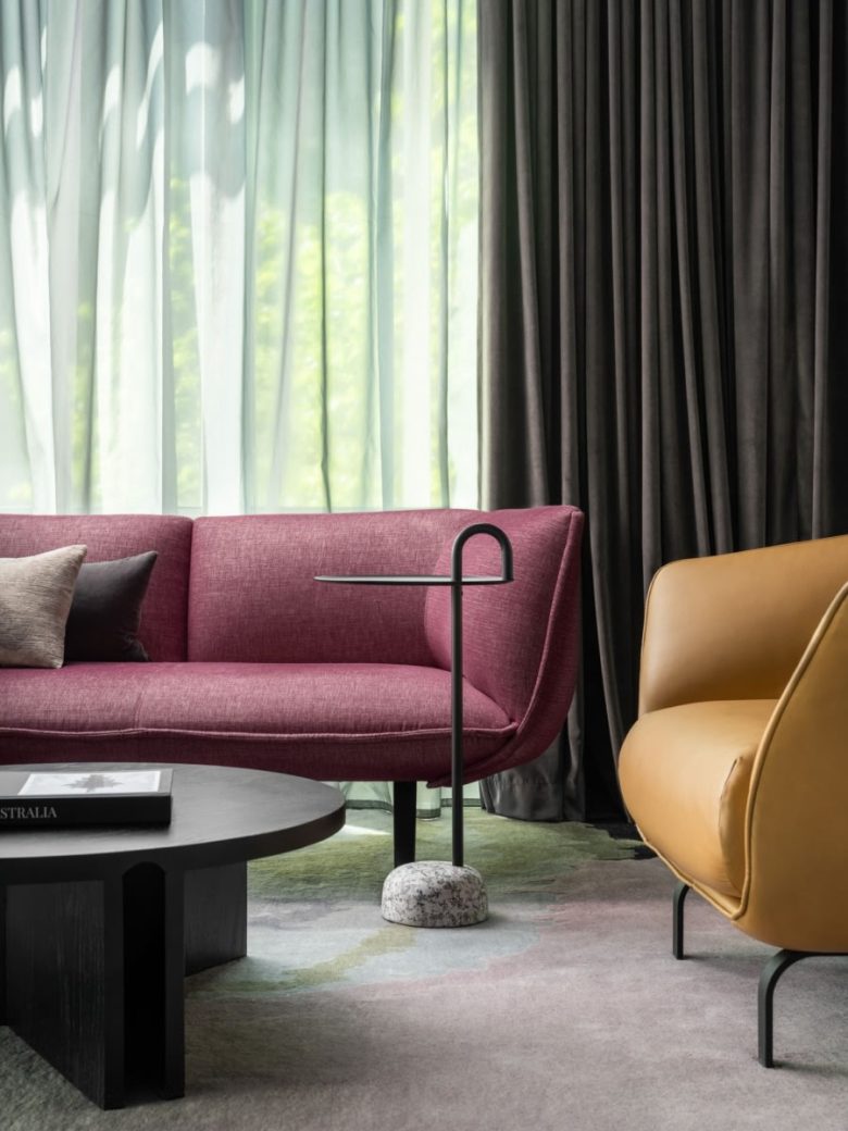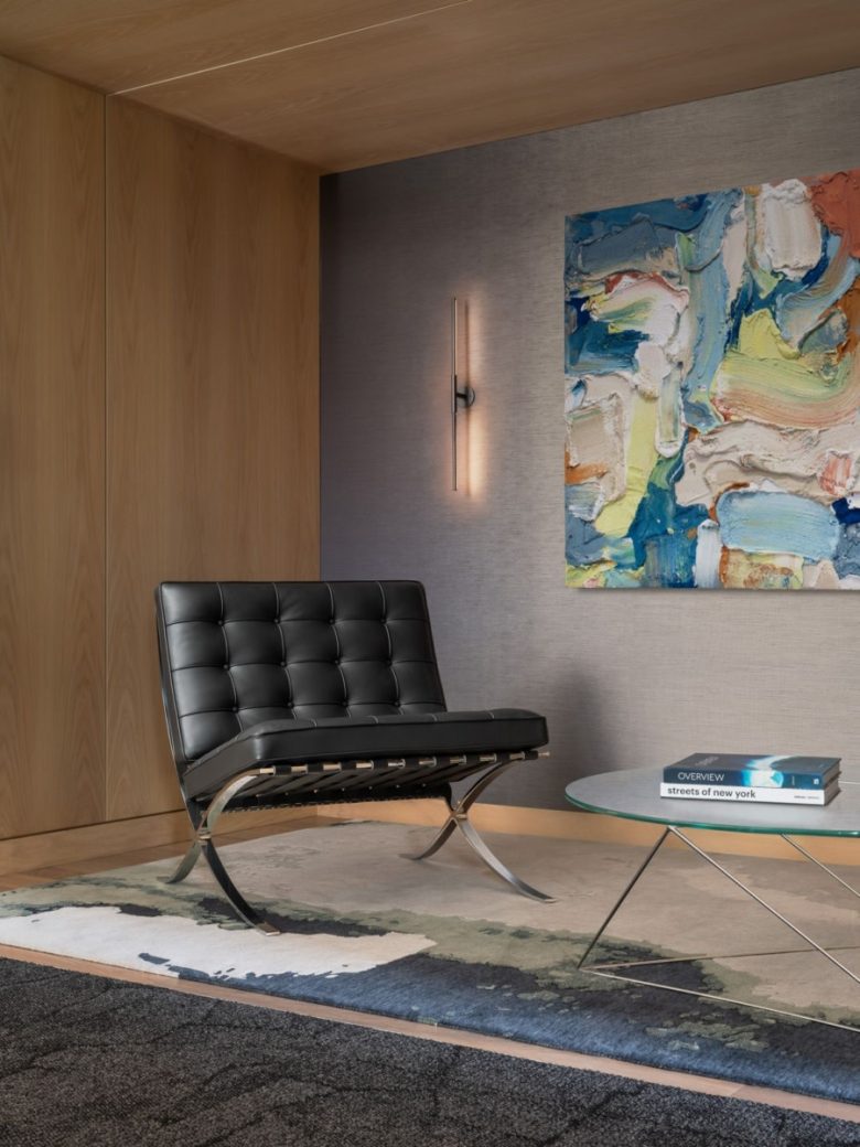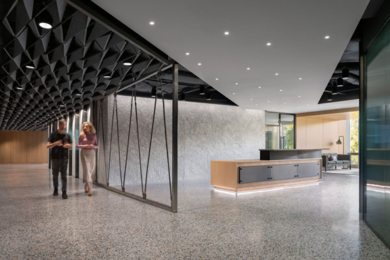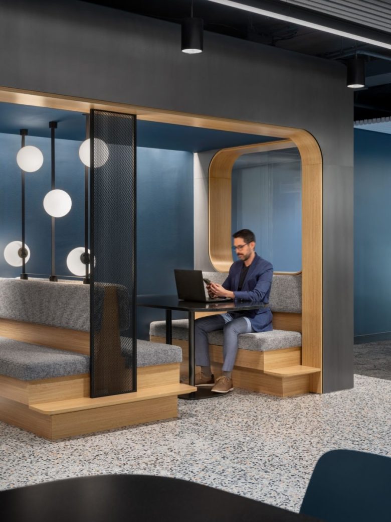 Our design builds on a layered and adaptable program that meets the present needs of a range of functions and workstyles while remaining flexible enough to accommodate those of the future. A grand, divisible conference room provides premier hosting capabilities, while adjacent breakout areas offer a curated mix of lounge seating configurations. A meticulously crafted work café – named in tribute to the founding CEO’s wife – nods to the organization’s corporate heritage with bespoke train-car-inspired banquette seating. Central to the project’s design narrative and programmatic structure is a passageway, coined Skybridge. Inspired by the Tacoma Narrows Bridge, this hall is a metaphor for time travel. As visitors traverse its length, stone etchings that chronologically represent the client’s most significant accomplishments unfold to spark conversation and cement the organization’s position as a leader within its field. These natural materials that speak to the past are boldly juxtaposed against a sweeping serpentine digital installation that arches fluidly for more than 50 across the pre-function space. Both a dynamic storytelling device and a flexible branding tool, the display showcases custom content modules that highlight the client’s legacy yet remains fully programmable should alternate content be required.