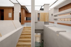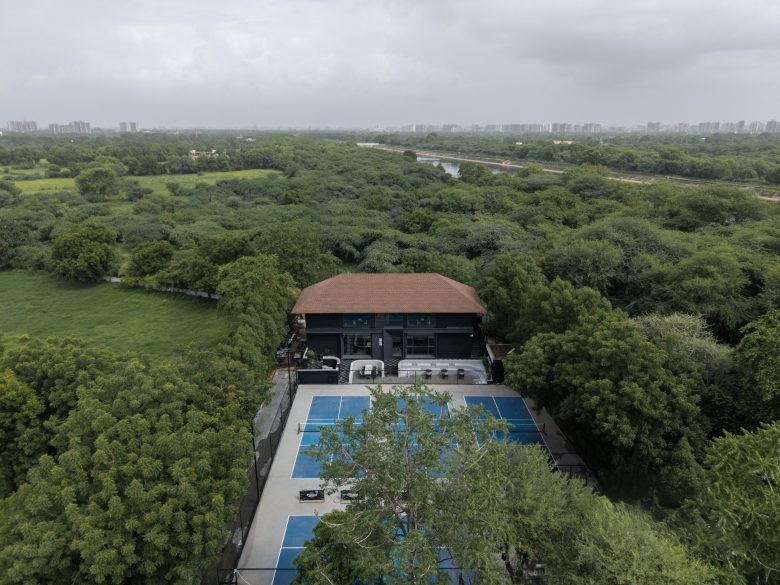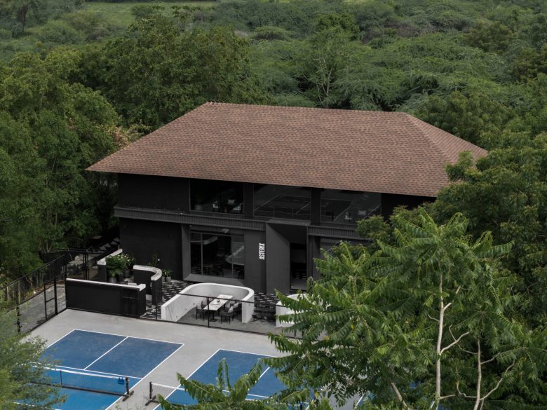 Spatially, the café unfolds as a multi-layered social environment. An outdoor amphitheater connects the café with adjoining pickleball courts, while the interior transitions from an intimate coffee space on the ground floor to a flexible cultural venue above, capable of hosting performances, exhibitions, and community events.