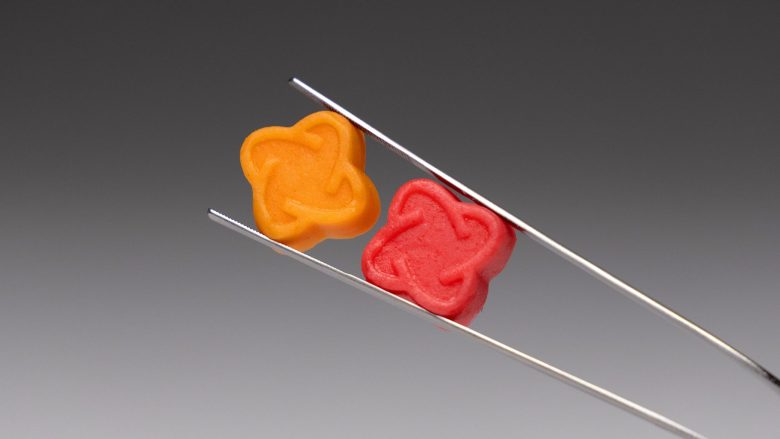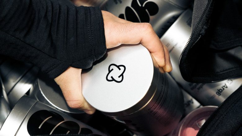 For gummies, custom atom-shaped pieces mirror the brand’s geometric logo. The jar features a frosted transparent window allowing product visibility and portion tracking. The powder jar continues the chrome aesthetic with functional wide opening.