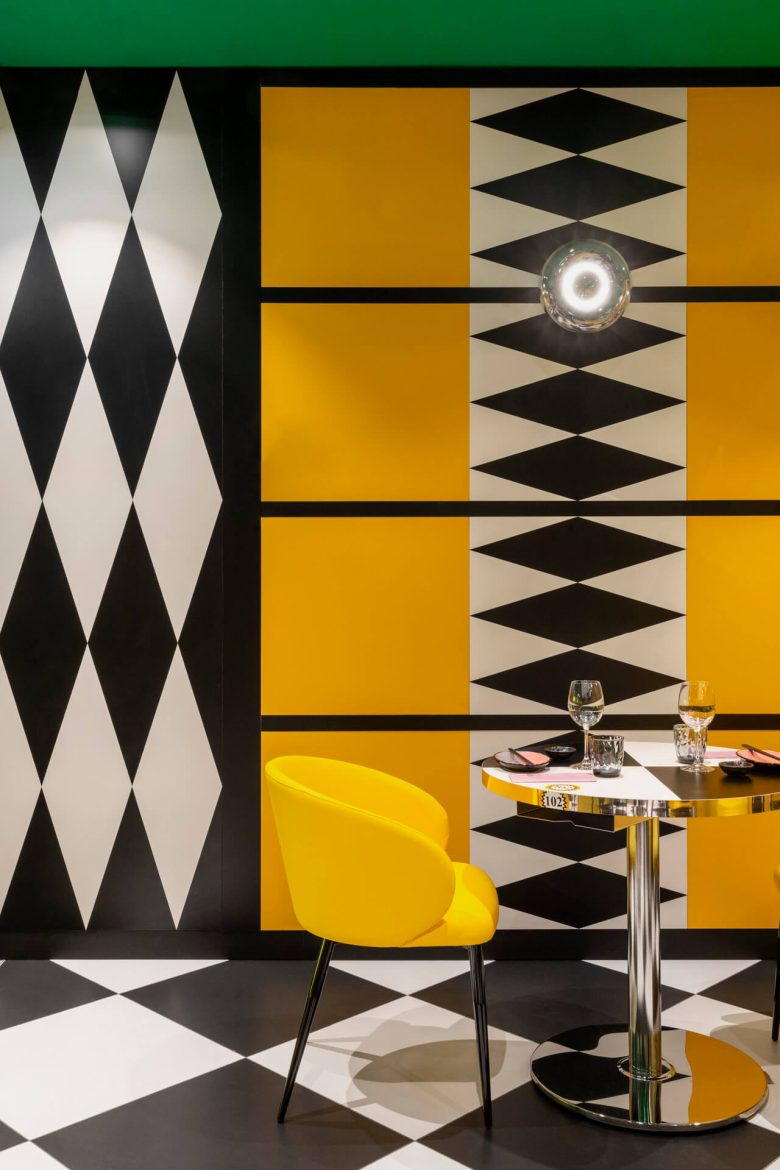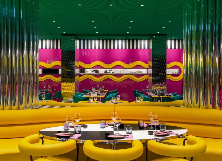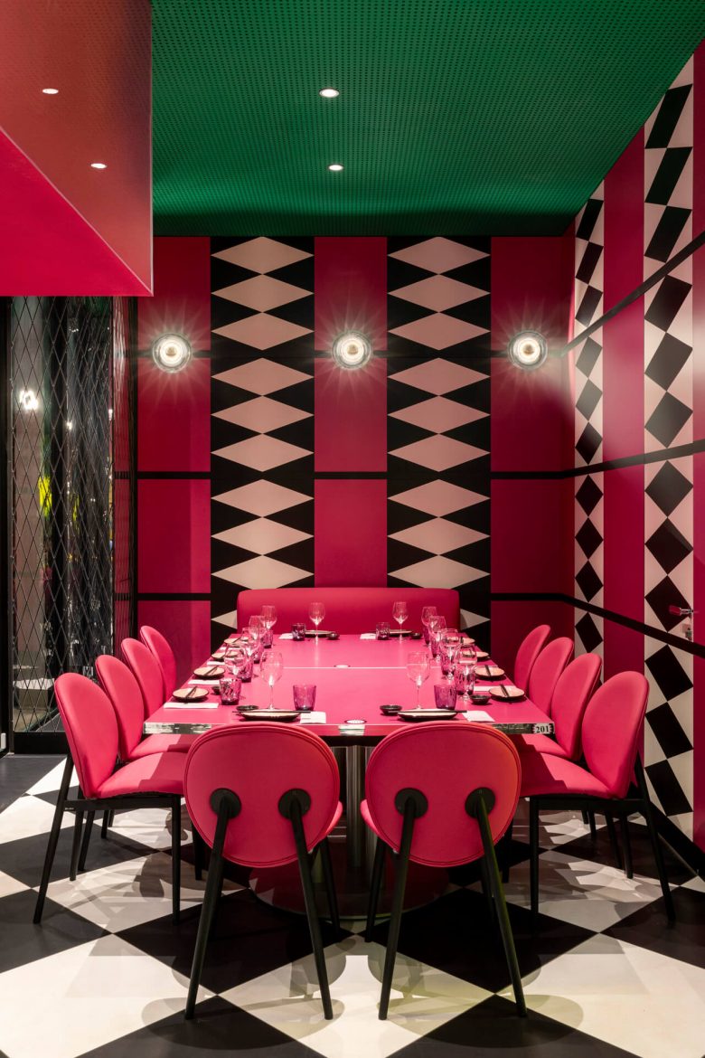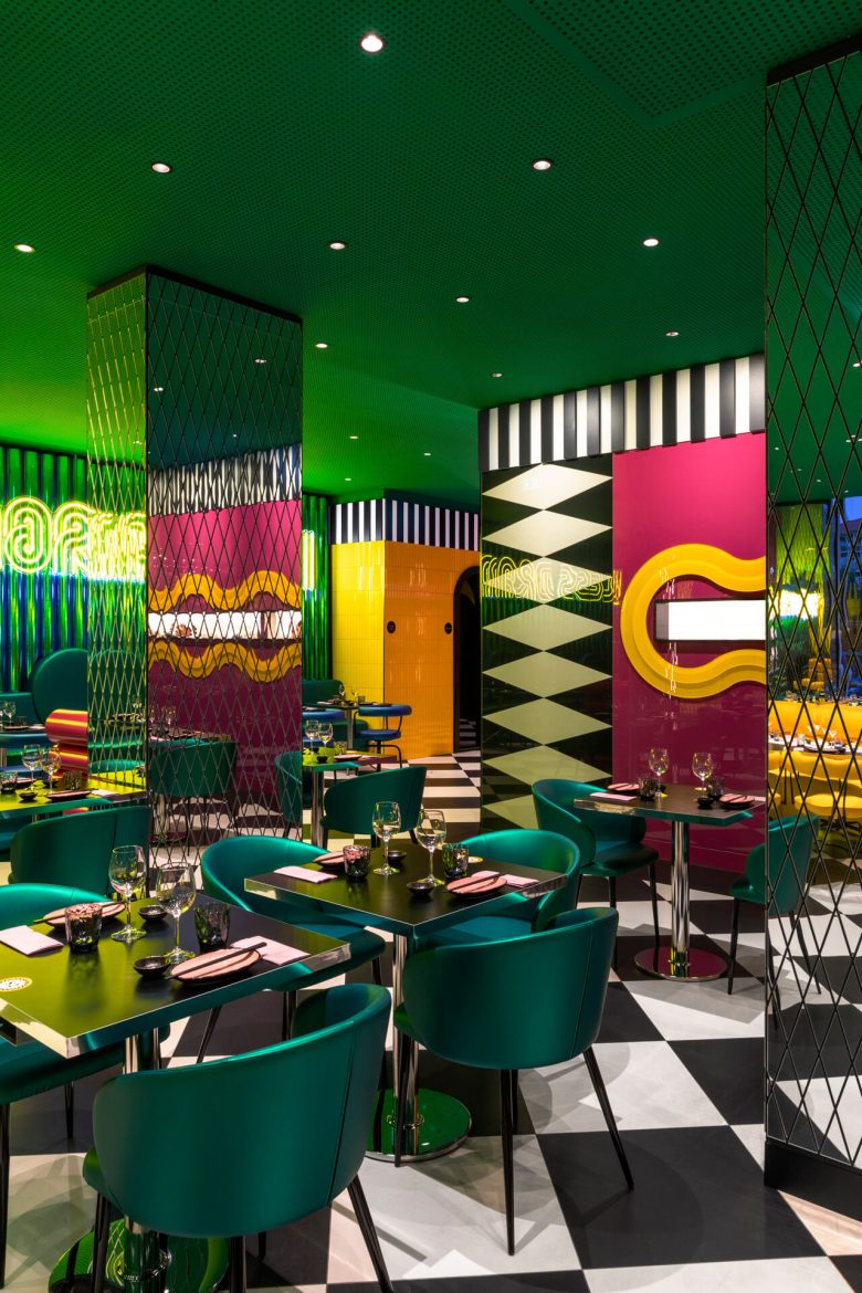 The concept stems from the desire to redefine the sushi restaurant format, experimenting with unconventional materials, reflective surfaces, and lighting solutions integrated into the architecture. Geometric graphics, iconic patterns, and saturated colors create an immersive and highly distinctive environment, where the experience of space becomes central.