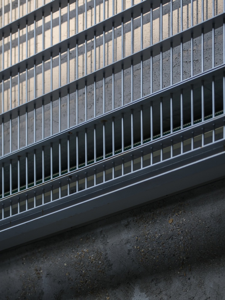 part 01. An Interface — We cloaked the building in a pioneering metal curtain—a bounded veil that opens a dialogue with its surroundings. At the entrance, a sliding metal door alternates between transparency and solidity, allowing nature to permeate the threshold. On the opposite side, the custom made metal gate for Organhaus follows a gridded, mechanical logic—a foldable entrance that continues Organhaus’s spirit of artistic experimentation, resembling a hangar door embedded in the mountain city, open to artists and creators. Dense silent gravel, flowing water features, and lush landscaping are woven into a mountain interface. The warm, humid climate of the Southwest naturally seeps into the building’s fabric, creating a “limite perceptive”—a perceptual boundary that asserts a contemporary presence within the existing industrial campus.