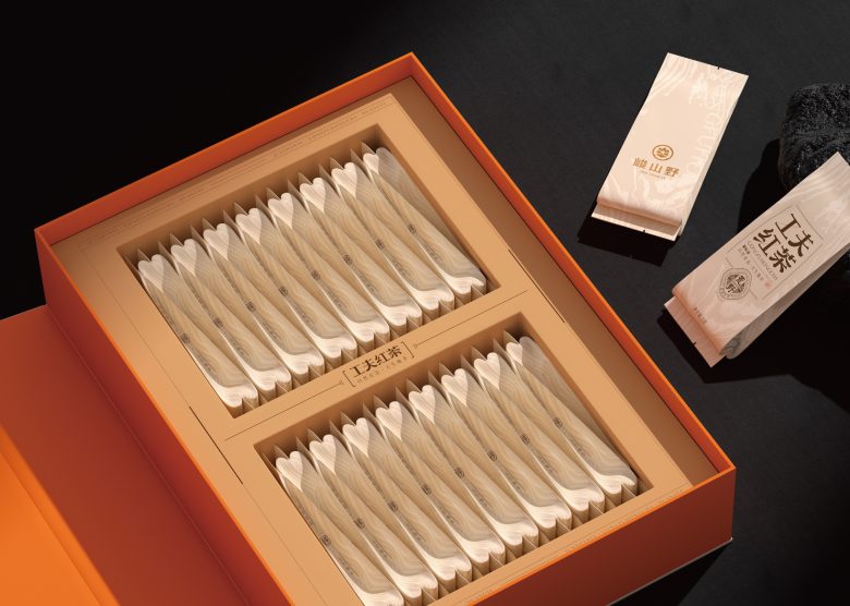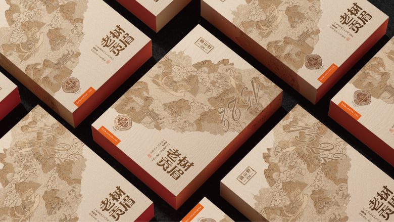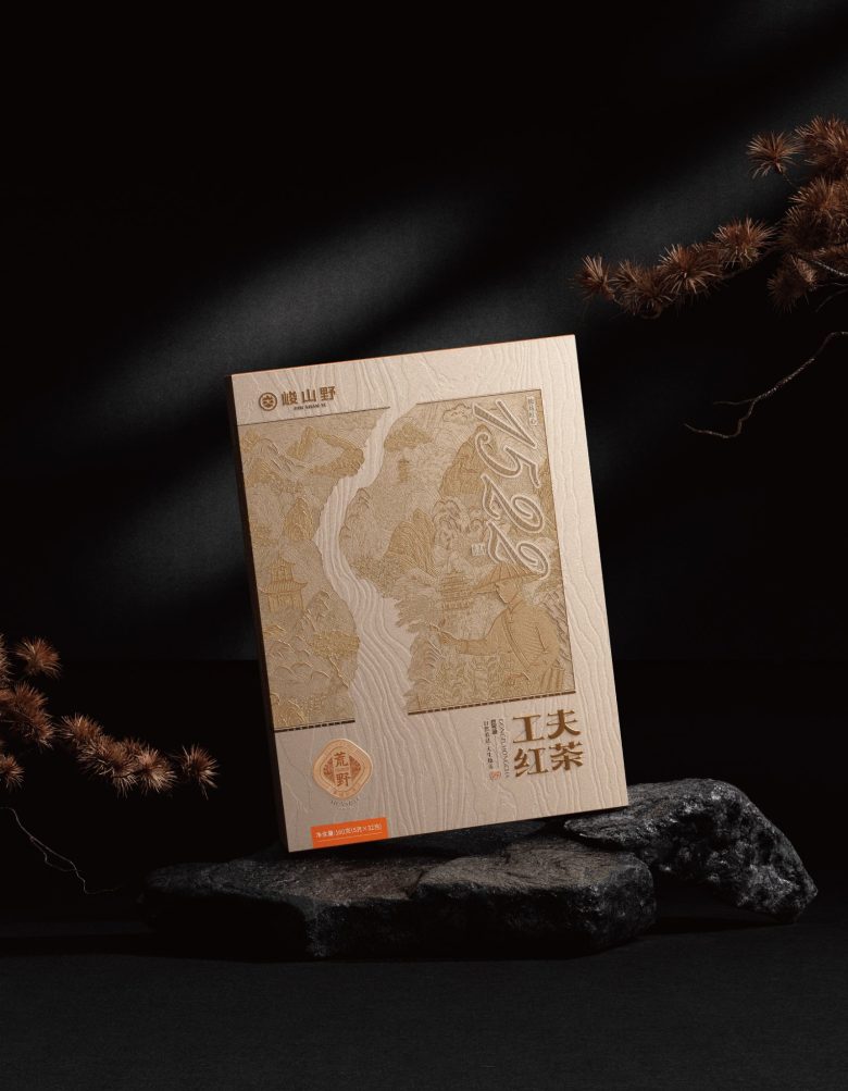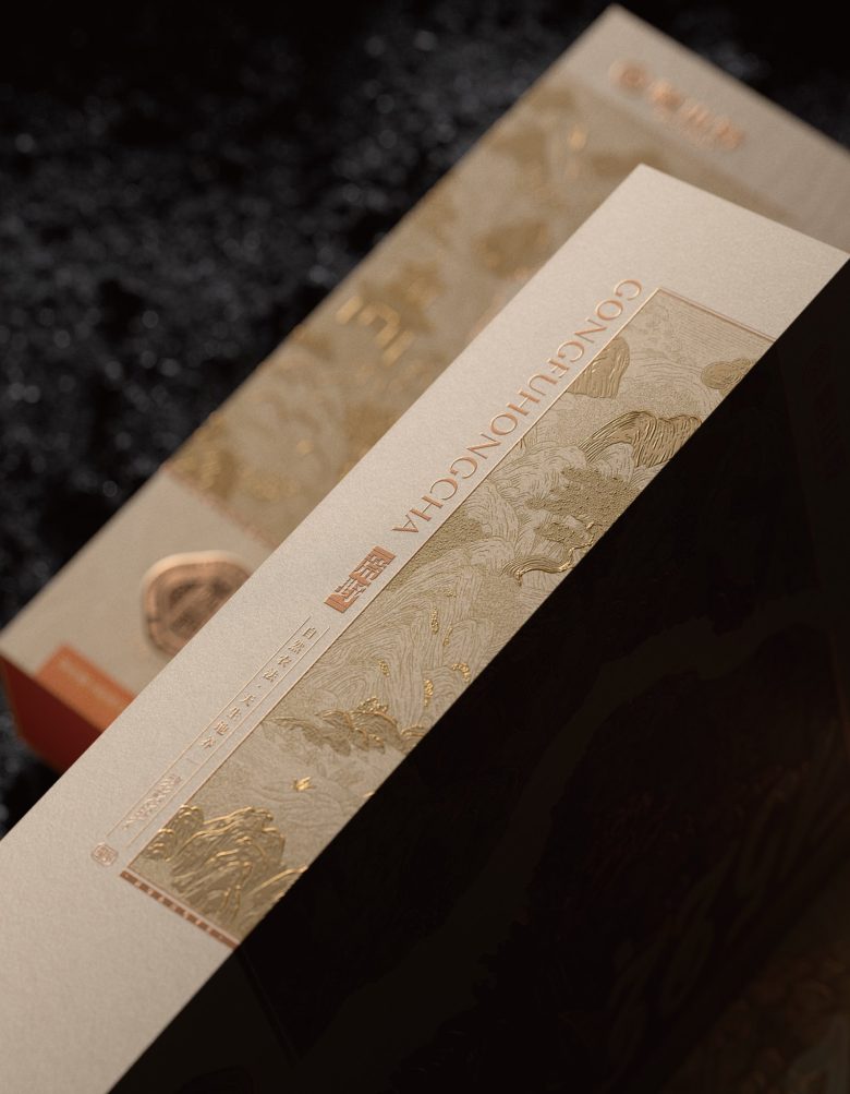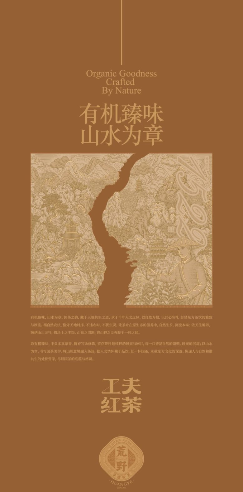 This packaging for Jun Shan Ye interprets organic tea through the visual language of traditional Chinese landscape art. The surface is dominated by an intricately embossed illustration of mountains, rivers, clouds, and flying cranes, forming a continuous scenic narrative that reflects harmony between nature and cultivation. Rendered in a single warm copper tone against a textured, paper-like background, the design evokes the feeling of classic woodblock or engraving techniques while maintaining a contemporary refinement. The landscape composition subtly guides the eye across the pack, transforming the box into a visual journey through nature. Elegant typography and seal-inspired brand marks reinforce authenticity and heritage, positioning the product within a cultural and artisanal context. By merging traditional aesthetics with restrained modern packaging structure, the design communicates purity, origin, and craftsmanship—elevating the tea as both a natural product and a culturally rooted experience.