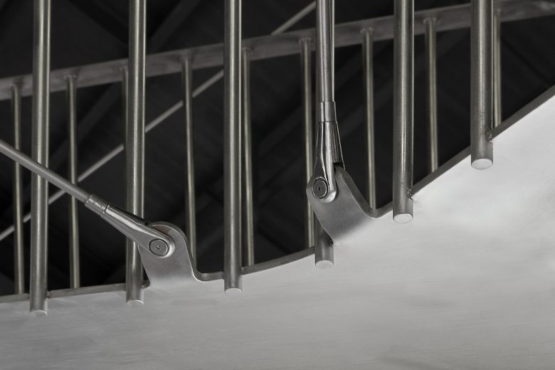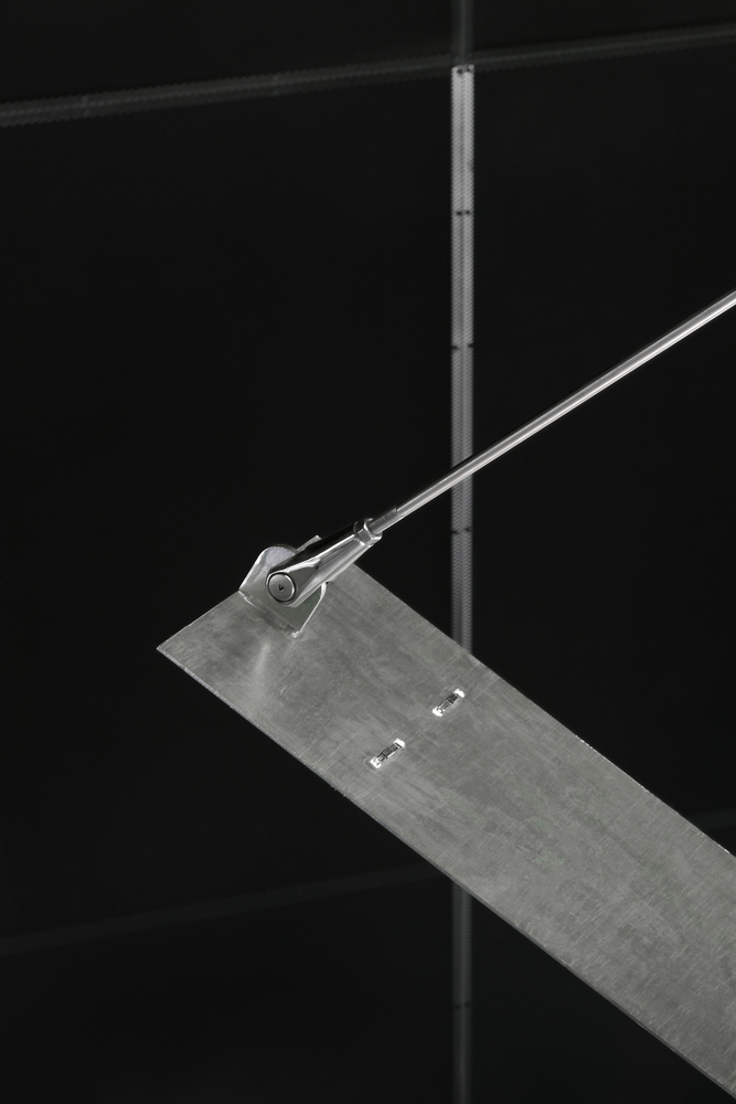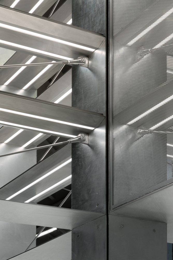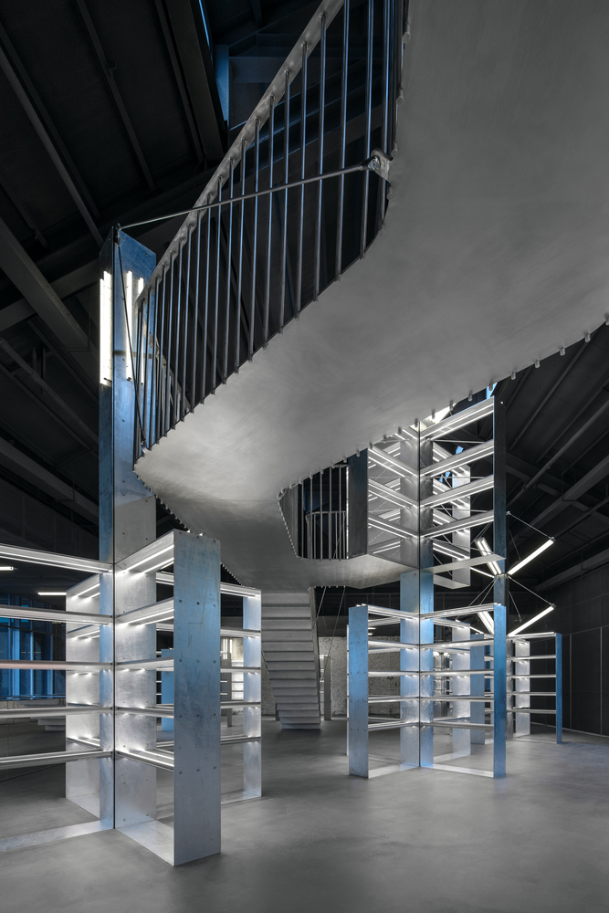 There are 11 cross-shaped display racks and an overpass arranged inside the factory building. The overpass adopts an ultra-thin beamless steel structure system. The whole overpass are made of one piece of 12mm-thick solid stainless steel plate, which is suspended from the central columns of several cross-shaped display racks via stay cables. Each cross-shaped display rack takes a metal frame as the basic unit. Shelves are built inside the frames for display purposes. Some racks cantilever a second layer of frames above with steel cables as the structure. The bottom of each cross-shaped display rack is flush with the ground and connected to the pre-embedded structural beams underneath. The display racks, the stay cable system and the overpass form a whole stable structure.