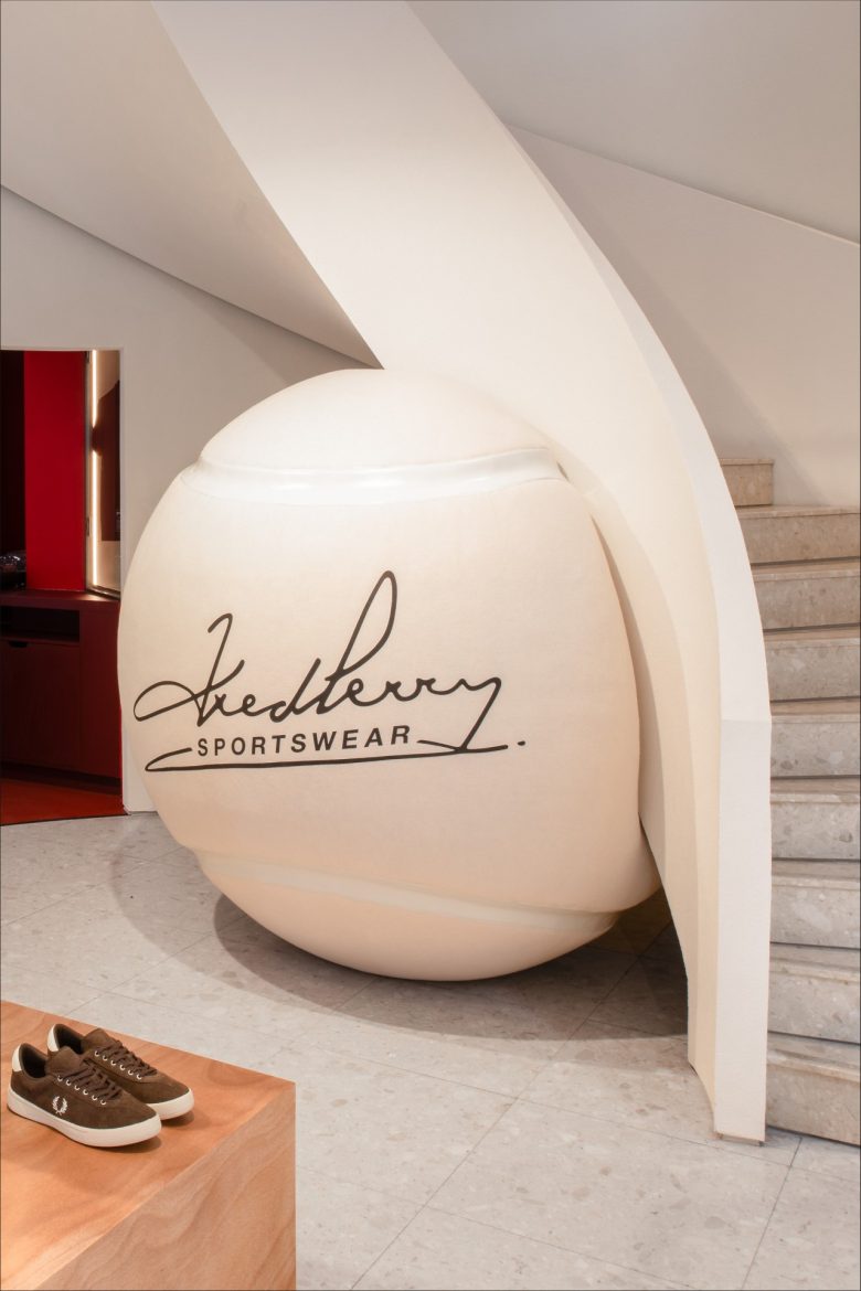 The glass bricks are overlaid by tiered shelving displaying Fred Perry shirts, the brand’s most iconic garment. A giant tennis ball as a base of the staircase leading to the first floor adds a whimsical note to the setting. Fred Perry‘s iconic logo, the laurel leaf, adorns the window in enlarged, neon form. Upstairs, a light-filled setting presents more apparel interspersed with artsy, brand-inspired installations. Additionally, an archive wall and exhibition-like setting provide shoppers engaging brand storytelling through digital and static graphics, light boxes and archival products. The new Fred Perry store stocks men’s apparel, accessories, and shoes. © superfuture