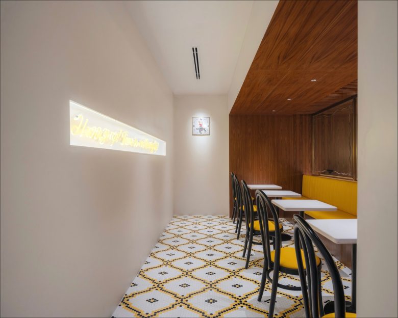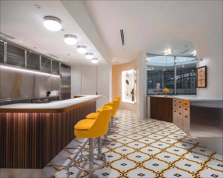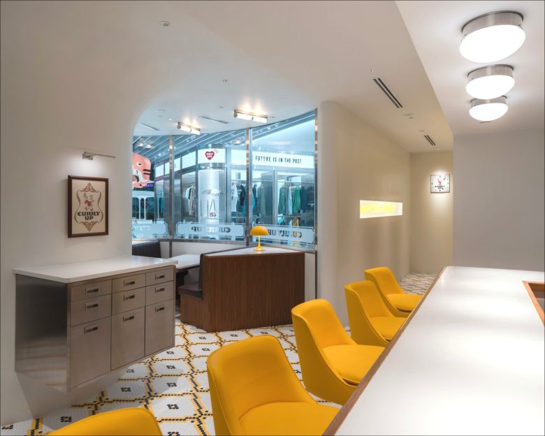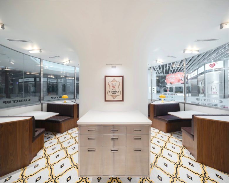 The store-exclusive collection features four limited-edition items, including graphic T-shirts, tote bags, and cushions, showcasing KAWS’s iconic character COMPANION embracing the KAWS MADE logo. The restaurant may be very visibly interlocked with the HUMAN MADE store, but it comes with a bright yellow façade and entrance all its own. Still understated yet with just a tad more embellishments, most evidently in the Portuguese-inspired pixelated floor tiles, and pops of yellow, the restaurant seats just 23 guests at a time in various configurations, including bar seating and booths. And as its name already implies, it serves a concise number Japanese-style curries, all paired with soft drinks. Additionally, the dining spot features branded apparel items of its own. © superfuture