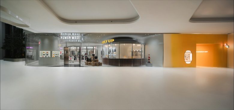 Today, the hotly anticipated HUMAN MADE store officially opens its doors at Central Embassy, one of Bangkok‘s leading luxury shopping playgrounds. The fashion brand by hugely popular Japanese designer and cultural icon Tomoaki Nagao a.k.a. NIGO has secured a spot on Level 2, and also brings along another first to the bustling Thai capital—CURRY UP, a Japanese curry restaurant the creative set up with Tokyo-based chef Kentaro Hashimoto. Occupying two partially glass-encased adjacent units, the interiors of both the retail space and restaurants have been designed by Wonderwall, an acclaimed architecture practice in Tokyo. The floor-to-ceiling glass façade of the HUMAN MADE store instantly reveals its interior to passers-by.