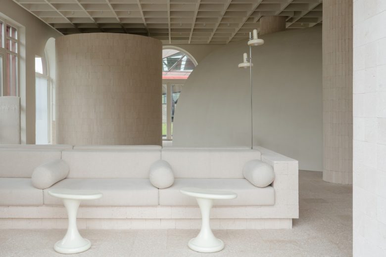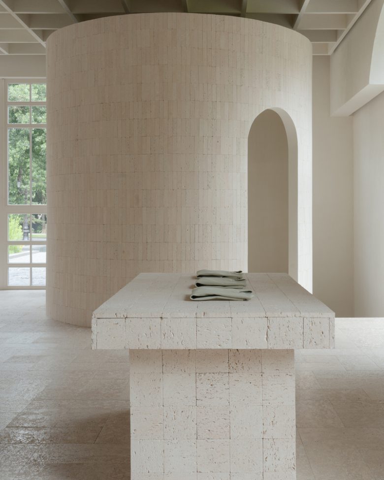 The material palette is intentionally restrained and rooted in the local context. Shell limestone from the Mangystau region runs throughout the project. It is used for wall and column cladding as well as for custom furniture pieces – tables, a sofa, shelving, and display units – bringing weight, tactility, and a sense of permanence to the space.