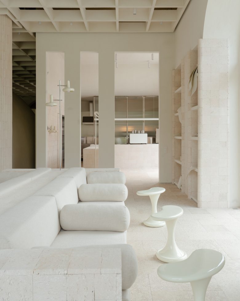 From the entrance, the interior opens up as a calm sequence of spaces. There is no visual noise or aggressive branding. The architecture sets a stable, balanced background that makes visitors want to stay a little longer. “We wanted Messa House to feel less like a store and more like quiet infrastructure for daily life, and to create a space that is easy to understand yet rich and challenging in the way it is made,” says Akhat Baimenov, the architect.