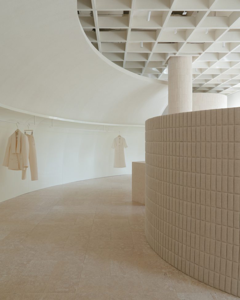 Spatial zoning is achieved through form and volume rather than partitions or decorative screens. The interior unfolds as a clear yet fluid sequence of interconnected areas: retail space, packaging zone, fitting rooms, café, and a small vestibule designed as a place to pause and rest. Each zone follows its own logic, but all of them feel like parts of one continuous story.