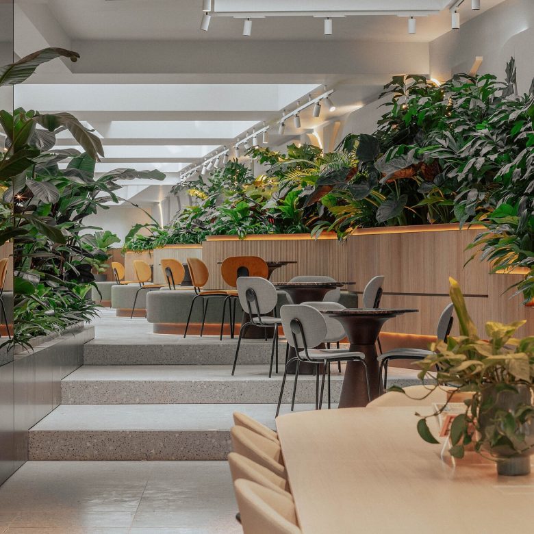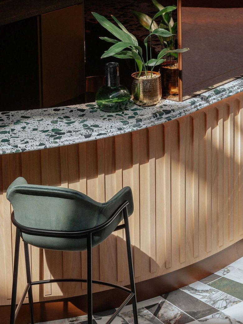 Material reuse extends to interior finishes, including the retention of terrazzo stair tiling and the integration of recycled elements such as the reception desk and selected furnishings. Volcanic ash countertops were specified as an alternative to conventional stone-based surfaces. Biogenic carbon stored in timber components contributes to temporary carbon sequestration within the building fabric.