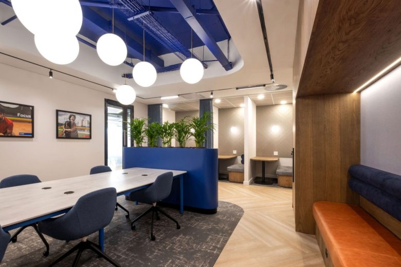 The layout reflects a shift toward activity-based hybrid working, balancing open-plan workstations with enclosed meeting rooms, acoustic call pods, touchdown areas and social spaces.