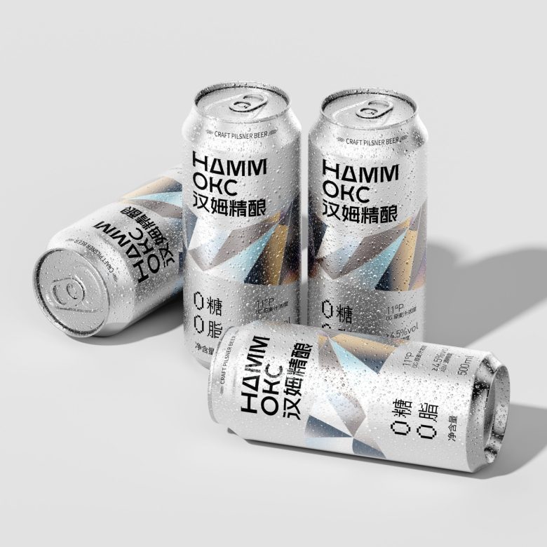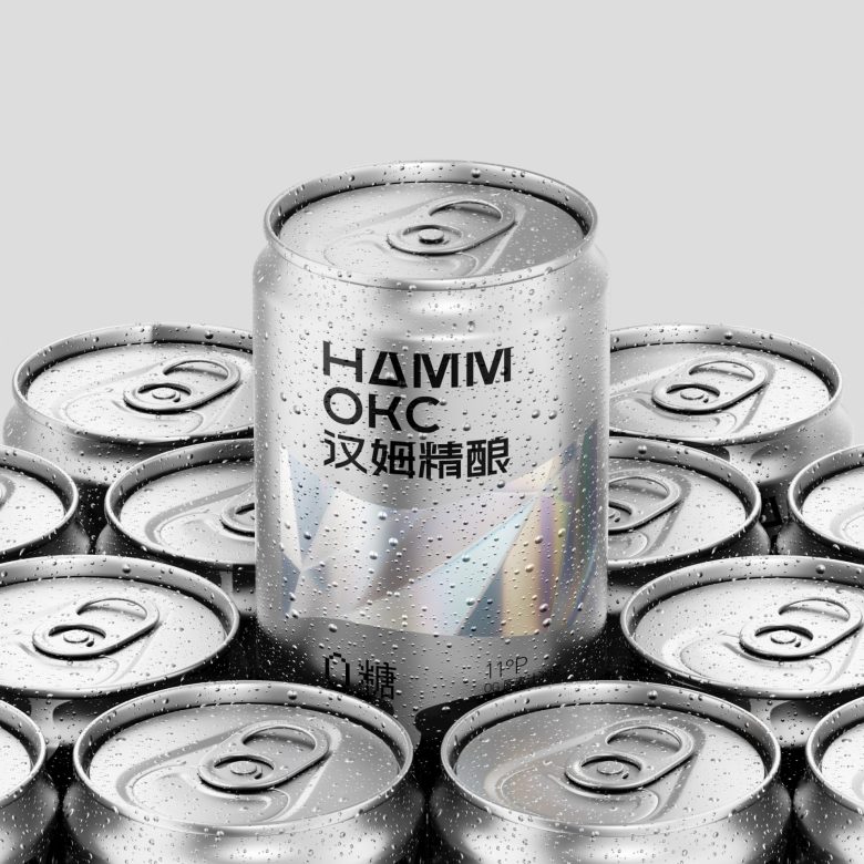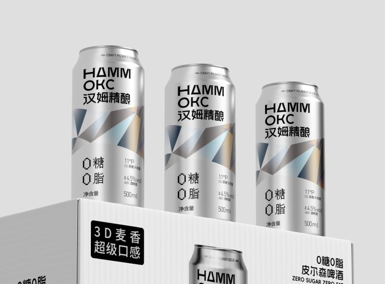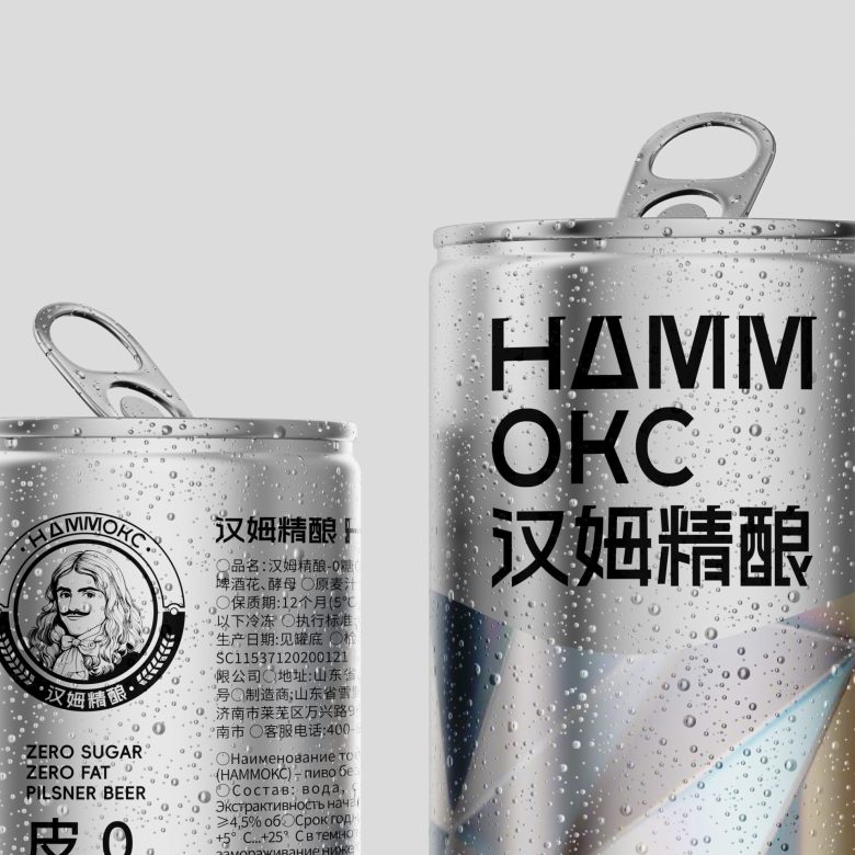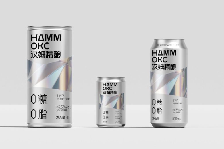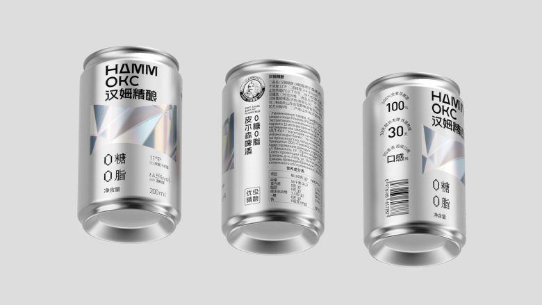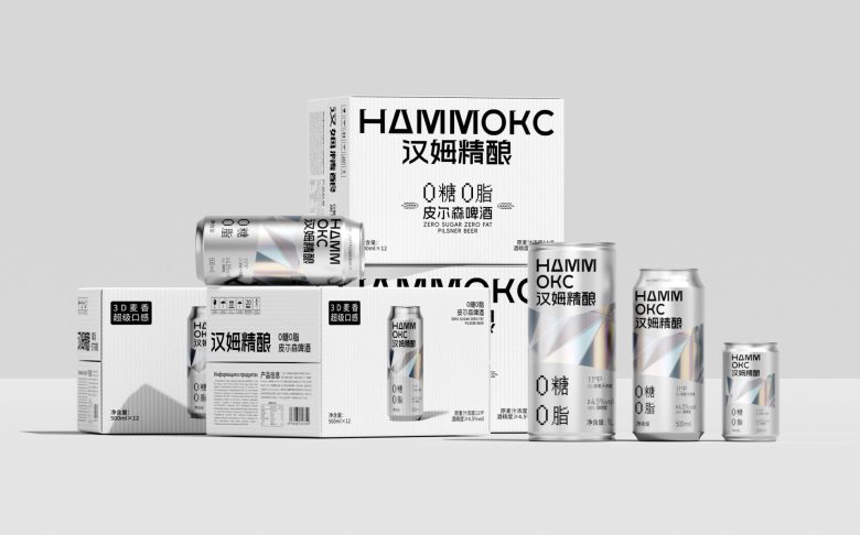 Hammoks (汉姆精酿) leans into the language of light for its Pilsner Beer series, wrapping the can in a fragmented prism motif that scatters across the silver substrate like refracted sunlight. The geometric facets — rendered in soft iridescent blues, golds, and silvers — feel simultaneously futuristic and crystalline, evoking the purity and crispness the brand promises with its zero-sugar, zero-fat positioning. The Cyrillic-meets-Chinese bilingual identity adds an unexpected cultural tension that works in the design’s favor, giving the craft beer a cosmopolitan edge rarely seen in the category. Typography is kept deliberately sparse and bold, letting the metallic canvas do the heavy lifting. It’s a confident, cohesive package that communicates premiumness without shouting — the kind of shelf presence that earns a second look before the first sip.