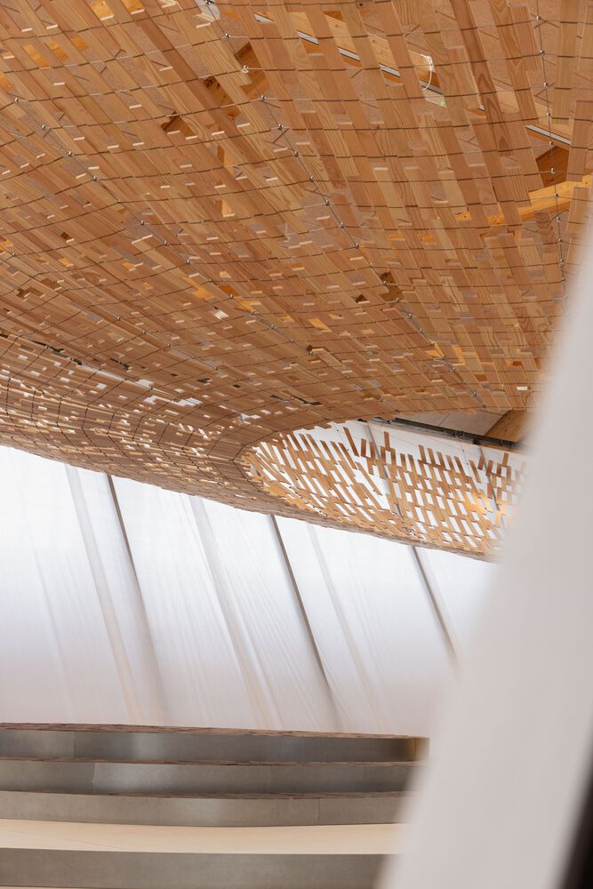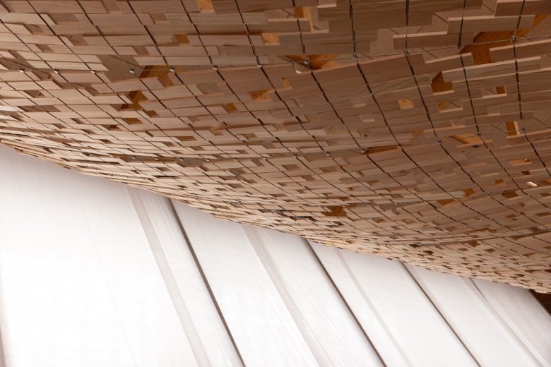 At the core of the installation is a suspended structure composed of handcrafted Dinesen Douglas fir elements. The wood is processed in collaboration with the Danish Troldkær School as part of an initiative to develop and empower students with special needs, an initiative supported by CC. The construction allows light to filter through and shift throughout the day, inspired by the Japanese concept of komorebi – the effect of sunlight passing through tree canopies and casting moving patterns of light and shadow.