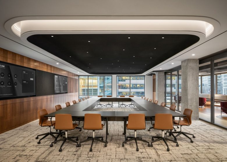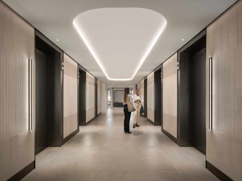 Visitors and tenants are met upon arrival, with a lobby sequence that serves to define the repositioning’s aesthetic identity. Immediately above the lobby on the second floor, a conference center and lounge extend the ground floor program upward. Flexible meeting and gathering spaces are complemented by adjacent seating areas anchored by a backlit stone bar and concealed wet wall. As guests circulate, indirect lighting, specialty ceilings, and carefully curated material transitions converge in a layered experience that guides movement through the space. In addition, renovated elevator lobbies, corridors, and restrooms on the third and ninth floors transform circulation into moments of architectural interest.