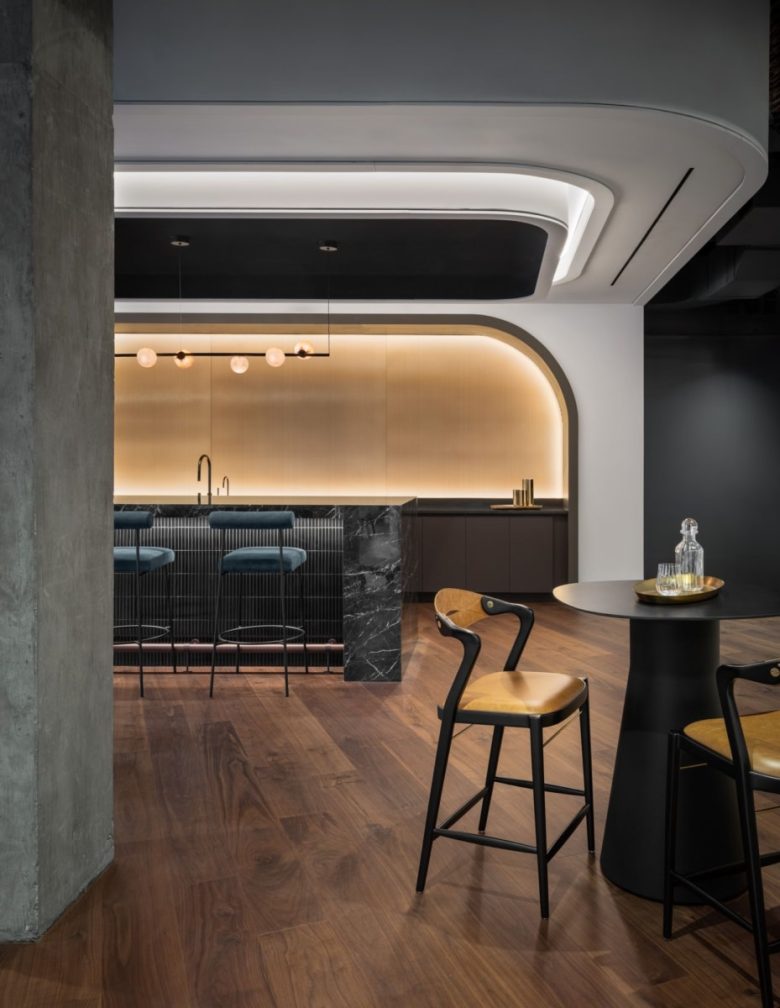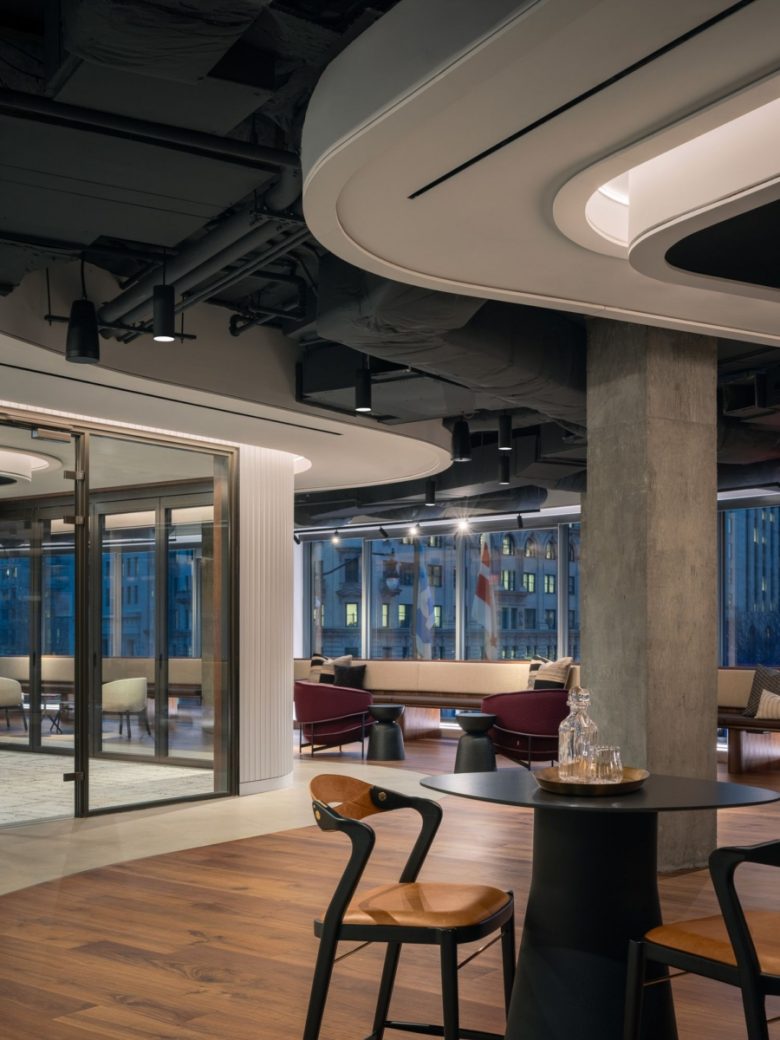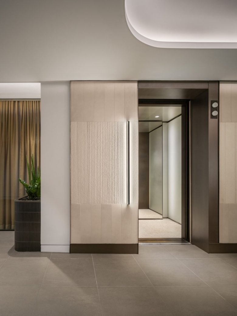 The design vernacular, in turn, balances a restrained palette of stone surfaces, wood accents, soft neutral tones, and thoughtfully detailed millwork against the drama inherent to the interconnecting stair. Custom lighting elements and subtle material contrasts reinforce a cohesive building identity while expanding the boundaries of each tenant’s workplace to arrive at a distinctive environment positioned for long-term success.
