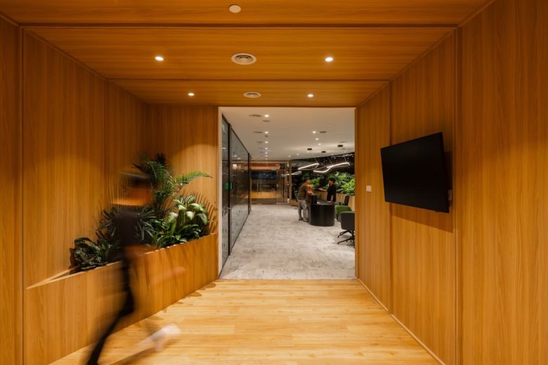 The unique “Timber Tunnel” Experience highlights the interplay of light, shadow, and natural timber, creating a distinctive spatial journey that separates workspace from client-facing areas.