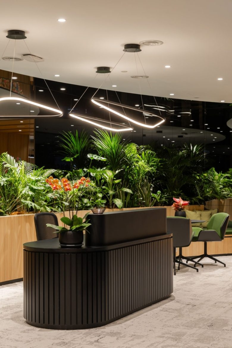 Incorporating live plants truly enhances the office environment, the extensive use of moss walls highlights the connection between nature and the workplace environment – resulting in a deep sense of balance and vitality. The patterns give the sense of dynamic movement which symbolizes the rapid growth and synergy in the company. With a bold personal workspace approach, our designers incorporated matte black worktops and furniture made of solid wood in a modular system to emphasize sustainability, adding both strength and sophistication to the workspace.