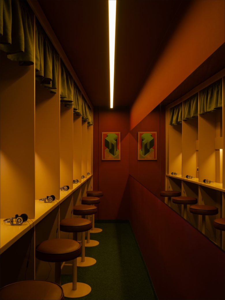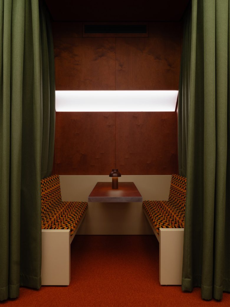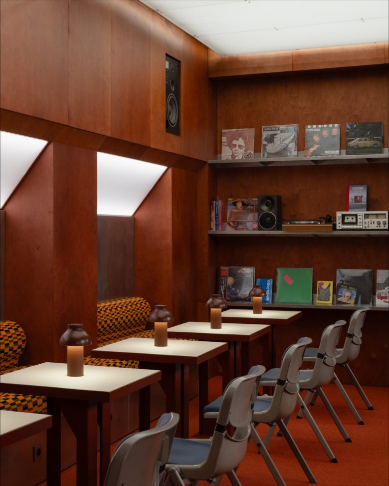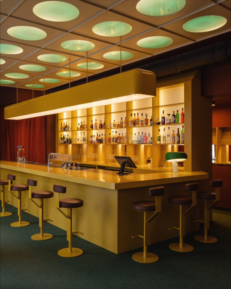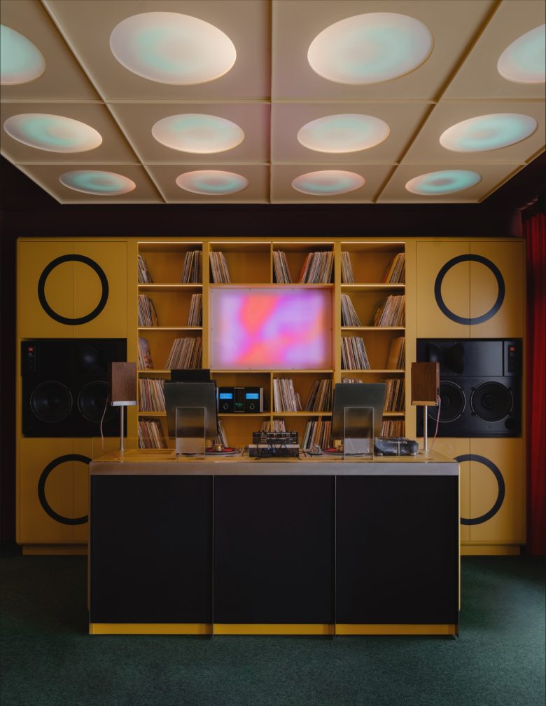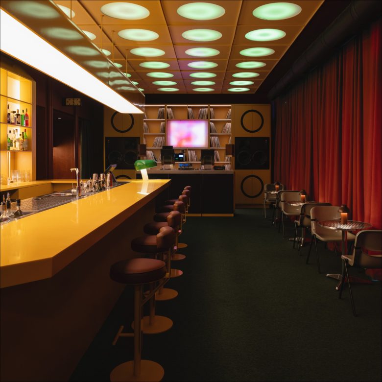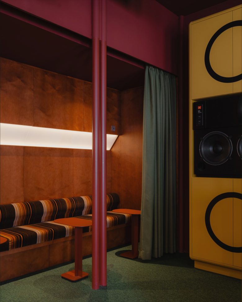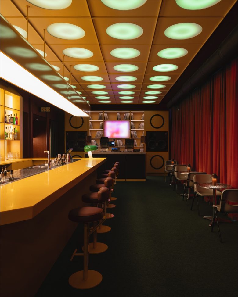 The key visual departure point of the interior design is the K67 kiosk, designed in 1966 by Yugoslav architect and designer Saša Mächtig. This design’s sensibility is reinterpreted through a post-modern lens, one where mid-century rigidity meets something more playful and cinematic. Esthetic Joys Embassy is first and foremost a place where to indulge and have fun, and consequently, music and a good sound system are essential. The venue is a listening bar, lounge and disco rolled into one, offering separate nooks for each, but all tied in by music provided by vintage JBL 4435 studio monitors and a solid vinyl record collection. Adding a strong visual dimension to the bar and lounge setting is a warm and playful yellow hue. Next to the bar, the DJ booth is entirely dipped in this colour. The ceiling’s grid of circular lights adds a space age touch to the setting, while left of the booth, a Dulton Double Face clock is hung.