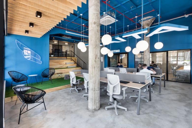 At the entrance level, the open space accommodates the area dedicated to the so-called “noise team,” where workstations are distributed between the exposed concrete columns. The presence of the original structure guides the organization of the layout, reinforcing the industrial character of the space and establishing a direct relationship between architecture and work dynamics. Within this same area, a breakout space was introduced with loose furniture and a synthetic grass floor, creating a more informal atmosphere and encouraging different ways of occupying the environment.