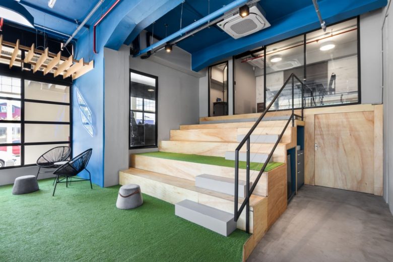 The stepped seating structure becomes a key element of the project, organizing the different levels of the office while also functioning as a space for presentations, gatherings and informal meetings. This element leads to the administrative areas and to the CEO’s office, located above the mezzanine level.