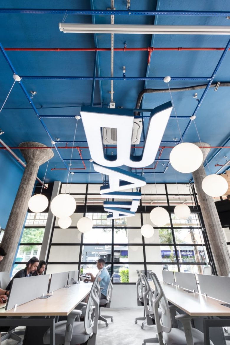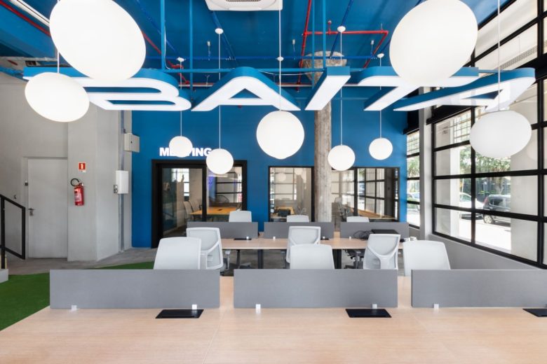 The material palette highlights the original structure while introducing contemporary elements that reinforce the company’s identity. The Baita brand was incorporated into the space as a lighting fixture positioned above the main work area, creating a direct connection between architecture and visual identity.