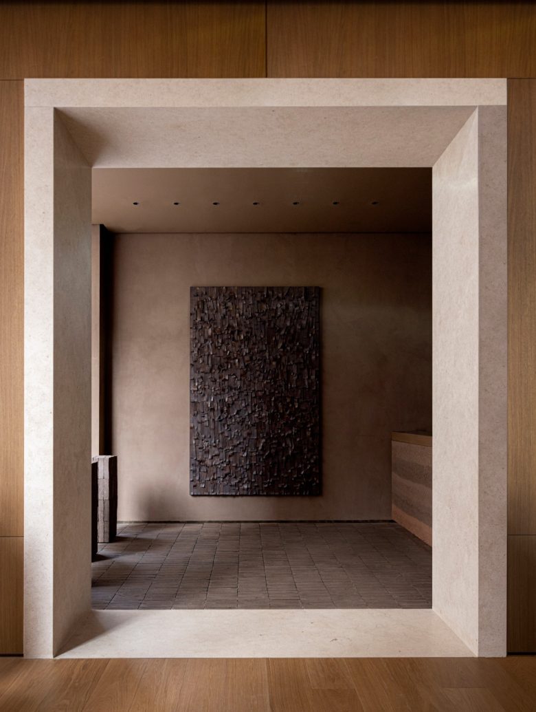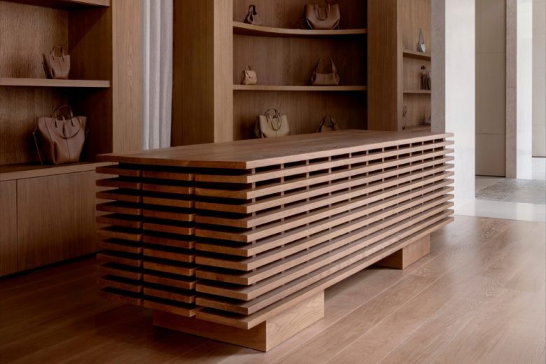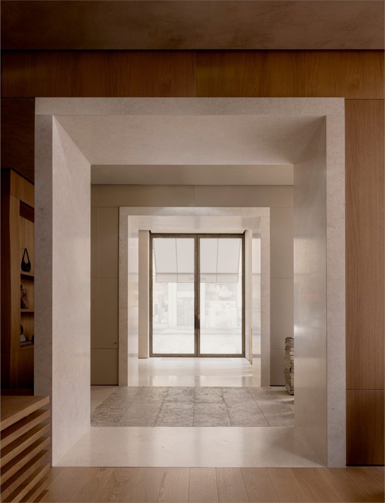 French leather bag brand Polène continues its global retail expansion, opening up shop in Milan‘s highly prestigious Duomo shopping district. The company has secured an elongated ground floor unit on the premises of a six-storey, 1950s office building on the corner of Via Manzoni and Via Pisoni, and tapped Copenhagen-based practice Norm Architects to create a retail setting inspired by Milanese interiors, their rich material palette, the tradition of enfilade spaces, and last but not least, Polène’s dedication to craftsmanship. Unsurprisingly, the store sees a series of rooms, offering shoppers a spatial journey adorned with materials often used in Milan’s architecture, ranging from stone and timber, to leather, brick, and fabric. This gradual deepening of tone and texture mirrors the making of the brand’s leather goods, and aims to establish a direct dialogue between product and space. Upon entering the store, the store’s spatial divisions are instantly visible, and invite shoppers to explore the space. Alongside a clearly defined axis, lined by large windows and installations on one side, various intimate nooks unfold, featuring beautifully crafted timber shelving units, cabinets, and counters, presenting various Polène bags, accessories and home products. At the far end, shoppers will find a wall-mounted ceramic installation can be found, elevating the shopping experience with a contemplative element. © superfuture