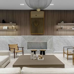Housed since the early 1990s in the so-called Vélodrome, a striking landmark stadium of concrete and glass built for bicycle racing at the 1976 Summer Olympics in Montreal, the Biodôme store has seen a bold revamp alongside the building’s renovation. An integral part of Espace pour la vie, or Space for Life in English, a prestigious complex dedicated exclusively to natural science, the job has been a collaborative one, executed by Adhoc architectes and Messier Designers. The 195 sqm. (2,100 sq.ft.) space has a soaring height, and thanks to large windows, it’s filled with an abundance of natural light. The Biodôme retail space sits at the end of a museum promenade, and obviously has its fair share of concrete and glass backdrop. The new interior design takes cues from the building’s aesthetic, but given the purpose of the complex, the aesthetic is also heavily inspired by the fundamental, biological unit of structure in every living being: the cell. This has resulted in semi-modular furnishings which can be spatially arranged and connected to construct more complex volumes, all in a hexagonal shape and crafted from laser-cut, folded and welded steel clad in a heavy-duty baked-on polymer paint with oak tops. The latter material has also been used as wall panels, all applied in an abstract mosaic on one side of the Biodôme shop, while directly opposite, an orderly of grid slats of pitch black timber allow the display of smaller items.